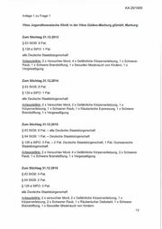 KA 20/1505 Anlage 1 zu Frage 1 Vitos Jugendforensische Klinik in der Vitos Gießen-Marburg gGmbH, Marburg: Zum Stichtag 31.12.2013 § 63 StGB: 9 Pat. § 126 a StPO: 1 Pat. alle Deutsche Staatsbürgerschaft Anlassdelikte: 2 x Versuchter Mord, 4 x Gefährliche Körperverletzung, 1 x Schwerer Raub, 1 x Schwere Brandstiftung, 1 x Sexueller Missbrauch von Kindern, 1 x Vergewaltigung Zum Stichtag 31.12.2014 § 63 StGB: 8 Pat. § 126 a StPO: 1 Pat. alle Deutsche Staatsbürgerschaft Anlassdelikte: 2 x Versuchter Mord, 2 x Gefährliche Körperverletzung, 1 x Körperverletzung, 1 x Schwerer Raub, 1 x Räuberische Erpressung, 1 x Schwere Brandstiftung, 1 x Vergewaltigung Zum Stichtag 31.12.2015 § 63 StGB: 6 Pat. - alle Deutsche Staatsbürgerschaft § 64 StGB: 1 Pat. - Deutsche Staatsbürgerschaft § 126 a StPO: 3 Pat. - 2 Pat. Deutsche Staatsbürgerschaft, 1 Pat. Guineanische Staatsbürgerschaft Anlassdelikte: 2 x Versuchter Mord, 4 x Gefährliche Körperverletzung, 2 x Schwerer Raub, 1 x Schwere Brandstiftung, 1 x Vergewaltigung Zum Stichtag 31.12.2016 § 63 StGB: 5 Pat. § 64 StGB: 2 Pat. § 126 a StPO: 3 Pat. alle Deutsche Staatsbürgerschaft Anlassdelikte: 2 x versuchter Mord, 2 x Gefährliche Körperverletzung, 1 x Körperverletzung, 2 x Schwerer Raub, 1 x Räuberischer Diebstahl, 1 x Schwere Brandstiftung, 1 x Sexueller Missbrauch von Kindern 13