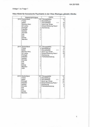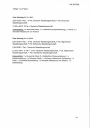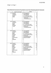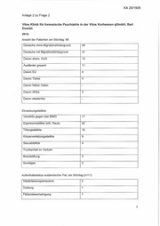 KA 20/1505 Anlage 1 zu Frage 1 Zum Stichtag 31.12. 2017 § 63 StGB: 6 Pat. - 5 Pat. Deutsche Staatsbürgerschaft, 1 Pat. Russische Staatsbürgerschaft § 126 a StPO: 2 Pat. - Deutsche Staatsbürgerschaft Anlassdelikte: 1 x versuchter Mord, 3 x Gefährliche Körperverletzung, 2 x Raub, 2 x Sexueller Missbrauch von Kindern Zum Stichtag 31.12.2018 § 63 StGB: 8 Pat. - 6 Pat. Deutsche Staatsbürgerschaft, 1 Pat. Afghanische Staatsbürgerschaft, 1 Pat. Eritreische Staatsbürgerschaft § 64 StGB: 1 Pat. - Deutsche Staatsbürgerschaft § 126 a StPO: 4 Pat. - 2 Pat. Deutsche Staatsbürgerschaft, 1 Pat. Afghanische Staatsbürgerschaft, 1 Pat. Gambische Staatsbürgerschaft Anlassdelikte: 1 x Versuchter Mord, 5 x Gefährliche Körperverletzung, 1 x Körperverletzung, 1 x Schwerer Raub, 1 x Schwere räuberische Erpressung, 1 x Raub, 1 x Schwere Brandstiftung, 1 x Sexueller Missbrauch von Kindern, 1 x Nachstellung 14