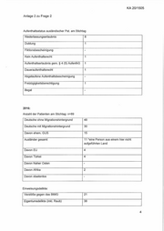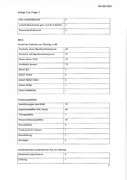 KA 20/1505 Anlage 2 zu Frage 2 Kein Aufenthaltsrecht 3 Aufenthaltserlaubnis gern. § 4 (5) AufenthG 2 Daueraufenthaltsrecht 2 2014: Anzahl der Patienten am Stichtag: n=86 Deutsche ohne Migrationshintergrund 46 Deutsche mit Migrationshintergrund 27 Davon ehern. GUS 15 Ausländer gesamt 13 Davon EU 3 Davon Türkei 6 Davon Naher Osten 3 Davon Afrika 1 Davon staatenlos - Einweisungsdelikte: Verstöße gegen das BtMG 15 Eigentumsdelikte (inkl. Raub) 43 Tötungsdelikte 7 Körperverletzungsdelikte 10 Sexualdelikte 6 Trunkenheit im Verkehr 1 Brandstiftung 1 Sonstiges Aufenthaltsstatus ausländischer Pat. am Stichtag Niederlassungserlaubnis 5 Duldung 1 2