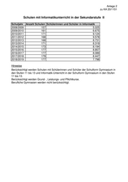Anlage 2 zu KA 20/1151 Schulen mit Informatikunterricht in der Sekundarstufe II Schuljahr Anzahl Schulen Schülerinnen und Schüler in Informatik 2008/2009 157 5.025 2009/2010 161 6.675 2010/2011 171 9.124 2011/2012 168 9.578 2012/2013 168 8.731 2013/2014 171 8.319 2014/2015 173 8.194 2015/2016 177 8.857 2016/2017 177 8.089 2017/2018 179 8.447 2018/2019 177 7.798 Hinweise Berücksichtigt werden Schulen mit Schülerinnen und Schüler der Schulform Gymnasium in den Stufen 11 bis 13 und Informatik-Unterricht in der Schulform Gymnasium in den Stufen 11 bis 13. Berücksichtigt werden Grund- , Leistungs- und Pflichtkurse. Berufliche Gymnasien werden nicht berücksichtigt.