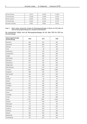Hessischer Landtag · 20. Wahlperiode · Drucksache 20/738 3 Kirchhain 114 103 77 Marburg 749 669 689 Schwalmstadt 163 173 183 Bad Schwalbach 141 142 132 Idstein 98 78 78 Rüdesheim 242 283 170 Wiesbaden 628 651 788 Hessen 15.858 15.831 16.217 Frage 3: Wie viele Berufsbetreuer sind seit 2016 als gesetzliche Vertreter in Hessen tätig? Die nachstehenden Tabellen weisen die Anzahl der seit 2016 eingesetzten Berufsbetreuerinnen und Berufsbetreuer aus (Ersteinrichtung und Bestandsverfahren; Rechtsanwältinnen und Rechts- anwälte werden als besondere Berufsgruppe gesondert ausgewiesen): Ersteinrichtung 2016 2017 2018 Rechtsanwälte als Be- 1.739 1.675 1.603 rufsbetreuer Sonstige Berufsbetreuer 4.727 4.651 5.499 (freiberuflich) Bestandsverfahren Rechtsanwälte als Be- 8.689 9.131 9.362 rufsbetreuer Sonstige Berufsbetreuer 30.929 31.650 32.647 (freiberuflich) Frage 4: Welche Bedarfsentwicklung wird in Bezug auf rechtliche Betreuer prognostiziert? Eine seriöse Prognose kann mangels verfügbarer Datengrundlage nicht abgegeben werden. Hes- senweit ist die Anzahl der Betreuungsverfahren allerdings zwischen 2016 und 2018 trotz eines geringfügigen Anstiegs in etwa gleich geblieben (s. Antwort auf Frage 2). Einem Anstieg der Verfahrenszahlen wirkt insbesondere die ständig steigende Zahl von Vorsorgevollmachten ent- gegen, für die das Hessische Ministerium für Soziales und Integration (HMSI) und das Hessi- sche Ministerium der Justiz (HMdJ) in Publikationen und Veranstaltungen werben. Derzeit gibt es bundesweit über 4 Millionen beim Zentralen Vorsorgeregister registrierte Vorsorgevollmach- ten und eine nicht abschätzbare Anzahl nicht registrierter Vollmachten, die im Umlauf sind. Frage 5: Wie hat sich die Dauer der Betreuungsverfahren in den letzten Jahren in Hessen entwickelt (bitte bezogen auf Abteilungen für Betreuungssachen der jeweiligen Amtsgerichte und in absoluter Zahl sowie Prozentzahl)? Die nachstehende Tabelle enthält Daten zur Verfahrensdauer für die Jahre 2017 und 2018 (ge- sondert ausgewiesen für im jeweiligen Kalenderjahr fortdauernde und beendete Betreuungsver- fahren). Für frühere Jahre und zu den einzelnen Amtsgerichten stehen keine validen Daten zur Verfü- gung. Dauer 2017 2018 fortdauernde Betreuungen 80.547 80.790 bis einschließlich 3 Monate 4.137 4.110 5,14 % 5,09 % mehr als 3 bis einschließlich 6 Monate 3.614 3.629 4,49 % 4,49 % mehr als 6 bis einschließlich 12 Monate 5.738 5.536 7,12 % 6,85 % Mehr als 1 Jahr bis einschließlich 5 Jahre 28.977 28.412