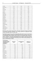 6 Hessischer Landtag · 20. Wahlperiode · Drucksache 20/738 Gießen 3,44 4,04 8,33 Gelnhausen 2,99 2,79 6,75 Hanau 2,98 3,18 6,96 Eschwege 2,22 2,96 5,91 Fritzlar 1,76 1,91 3,94 Kassel 8,59 9,46 20,06 Korbach 1,34 1,86 3,62 Melsungen 0,49 0,62 1,22 Dillenburg 2,29 2,18 5,13 Limburg 1,94 1,52 3,86 Weilburg 0,87 0,98 2,09 Wetzlar 2,11 2,62 5,39 Biedenkopf 0,77 1,01 2,00 Frankenberg 1,35 1,21 2,92 Kirchhain 0,60 0,80 1,56 Marburg 2,57 2,23 5,11 Schwalmstadt 1,36 1,90 3,91 Idstein 0,53 0,69 1,42 Rüdesheim 1,60 1,35 3,51 Bad Schwalbach 0,66 0,85 1,70 Wiesbaden 3,66 4,60 9,21 Planstellen werden einzelnen Amtsgerichten, nicht jedoch zielgerichtet bestimmten Abteilungen des jeweiligen Amtsgerichts zugewiesen. Die Verteilung innerhalb der Amtsgerichte auf die einzelnen Abteilungen regeln die Gerichte selbst. Zur Stellenbesetzung bei den jeweiligen Amtsgerichten können daher nur die aus den Personal- übersichten entnommenen Angaben zur durchschnittlichen Personalverwendung im Jahr 2018 in der nachstehenden Tabelle dargestellt werden. Dabei wird das tatsächlich tätige Personal aus- gewiesen. Bedienstete, die in dem Berechnungsquartal aus anderen Gründen als Erholungs- urlaub, Teilnahme an Fortbildungsveranstaltungen oder Zeitausgleich wegen Mehrarbeit mehr als 20 Arbeitstage in der Dienststelle nicht anwesend waren, werden nicht berücksichtigt (z.B. längere krankheitsbedingte Ausfälle). Durchschnittliche Personalverwendung in Richterlicher Rechtspflegerischer Mittlerer und Betreuungs- und Unter- Dienst Dienst Schreibdienst bringungssachen Erwachsener Hessen 81,36 85,14 143,74 Bensheim 1,23 1,21 1,78 Darmstadt 3,00 3,53 4,63 Dieburg 0,90 0,96 1,78 Fürth 0,70 1,10 2,07 Groß-Gerau 1,60 2,10 2,43 Rüsselsheim 0,70 1,24 2,00 Lampertheim 1,03 0,68 1,56 Langen 1,25 1,23 2,45 Michelstadt 1,65 1,55 4,47 Offenbach 3,60 2,68 5,95 Seligenstadt 0,67 0,80 1,65
