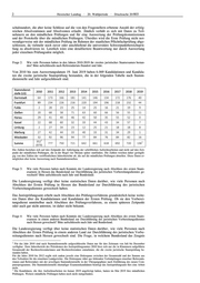 2 Hessischer Landtag · 20. Wahlperiode · Drucksache 20/803 schulstandort, die aber keine Schlüsse auf die von den Fragestellern erbetene Anzahl der erfolg- reichen Absolventinnen und Absolventen erlaubt. Ähnlich verhält es sich mit Daten zu Teil- nehmern an den mündlichen Prüfungen und für eine Auswertung der Prüfungskommissionen und der Protokolle über die mündlichen Prüfungen. Überdies wird die Erste Prüfung nicht not- wendigerweise mit der mündlichen Prüfung im Rahmen der staatlichen Pflichtfachprüfung abge- schlossen, da vielmehr noch zuvor oder anschließend die universitäre Schwerpunktbereichsprü- fung zu absolvieren ist. Letztlich wäre eine detailliertere Beantwortung nur durch Auswertung jeder einzelnen Prüfungsakte möglich. Frage 2: Wie viele Personen haben in den Jahren 2010-2019 ihr zweites juristisches Staatsexamen bestan- den? Bitte aufschlüsseln nach Referendariats-Standort und Jahr. Von 2010 bis zum Auswertungsdatum 19. Juni 2019 haben 6.069 Kandidatinnen und Kandida- ten die zweite juristische Staatsprüfung bestanden, die in der folgenden Tabelle nach Stamm- dienststelle und Jahr aufgeschlüsselt sind. Stammdienst- 2010 2011 2012 2013 2014 2015 2016 2017 2018 2019 stelle (LG) Darmstadt 64 173 166 181 141 146 134 172 176 40 Frankfurt 89 234 226 216 220 194 196 218 232 44 Fulda 2 28 23 25 14 25 16 21 19 9 Gießen 20 68 58 71 63 60 66 56 55 11 Hanau 29 41 40 46 42 50 35 55 52 0 Kassel 22 68 60 32 33 44 43 34 57 7 Limburg 2 27 34 23 12 25 21 18 18 8 Marburg 27 42 44 33 40 33 31 34 29 1 Wiesbaden 32 92 96 94 77 84 76 84 82 16 2 352 3 Summe 777 750 721 642 661 618 692 720 136 (979) Die Zahlen beziehen sich auf den Zeitpunkt der Anfertigung der schriftlichen Aufsichtsarbeiten und nicht auf den Zeit- punkt der mündlichen Prüfungen, die in der Regel vier Monate später stattfinden. Die Zahlen weichen daher geringfü- gig von den Zahlen der veröffentlichten Jahresberichte ab, die auf die mündlichen Prüfungen abstellen. Diese Daten er- möglichen aber keine Auswertung nach Stammdienststellen. Frage 3: Wie viele Personen haben nach Kenntnis der Landesregierung nach Abschluss des ersten Staats- examens in Hessen das Bundesland zur Durchführung des juristischen Vorbereitungsdienstes ge- wechselt? Bitte aufschlüsseln nach Jahr und Bundesland. Die Landesregierung verfügt über keine statistischen Daten darüber, wie viele Personen nach Abschluss der Ersten Prüfung in Hessen das Bundesland zur Durchführung des juristischen Vorbereitungsdienstes gewechselt haben. Das Justizprüfungsamt erhebt nach Abschluss des Prüfungsverfahrens grundsätzlich keine weite- ren Daten über die Kandidatinnen und Kandidaten der Ersten Prüfung. Ob sie den Vorberei- tungsdienst unmittelbar nach Abschluss des Prüfungsverfahrens, zu einem späteren Zeitpunkt oder auch gar nicht antreten, ist daher nicht bekannt. Frage 4: Wie viele Personen haben nach Kenntnis der Landesregierung nach Abschluss des ersten Staats- examens in einem anderen Bundesland zur Durchführung des juristischen Vorbereitungsdienstes nach Hessen gewechselt? Bitte aufschlüsseln nach Jahr und Bundesland. Die Landesregierung verfügt über keine statistischen Daten darüber, wie viele Personen nach Abschluss der Ersten Prüfung in einem anderen Land zur Durchführung des juristischen Vorbe- reitungsdienstes nach Hessen gewechselt sind. Die Frage, in welchem Bundesland das Zeugnis 2 Für das Jahr 2010 sind nach Stammdienststelle aufgeschlüsselte Daten nur für den Zeitraum von Juli bis Dezember verfügbar. Dem Jahresbericht des Präsidenten des Justizprüfungsamtes 2010 lässt sich nur die in Klammern aufgeführte Gesamtzahl der Rechtsreferendarinnen und Rechtsreferendare entnehmen, die die zweite juristische Staatsprüfung be- standen haben. Für die Jahre 2010 bis 2012 ergibt sich zudem jeweils eine Diskrepanz zwischen der Gesamtzahl und der Summe aus den Teilzahlen für die einzelnen Landgerichte. Die Diskrepanz rührt aus fehlenden Verknüpfungen einzelner Referenda- rinnen und Referendare mit der jeweiligen Stammdienststelle in der Übergangsphase nach Einführung des neuen Com- puterprogramms. Die Stammdienststelle ehemaliger Examenskandidaten benötigt das Justizprüfungsamt fürs eine Arbeit nicht. 3 Die Kandidaten, die ihre Aufsichtsarbeiten im Januar 2019 angefertigt haben, hatten im Mai 2019 ihre mündlichen Prüfungen. Weitere mündliche Prüfungen haben noch nicht stattgefunden.