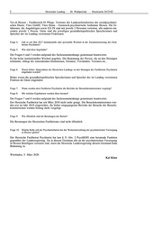 20. Wahlperiode Drucksache 20/2142 HESSISCHER LANDTAG 18. 03. 2020 Kleine Anfrage Christiane Böhm (DIE LINKE) vom 29.01.2020 Fachbeirat Psychiatrie und Antwort Minister für Soziales und Integration Vorbemerkung Fragestellerin: Nach § 31 PsychKHG wird ein Fachbeirat Psychiatrie unter Leitung des für Gesundheit zuständigen Ministe- riums eingerichtet. Dieser soll das Ministerium in Fragen der psychiatrischen Versorgung beraten, dient der Koordinierung der verschiedenen Beteiligten des psychiatrischen Versorgungssystems und erhält unter anderem die Berichte der Besuchskommissionen nach § 13 Abs. 4 Satz 1 PsychKHG zur Beratung. Diese Vorbemerkung der Fragestellerin vorangestellt beantworte ich die Kleine Anfrage wie folgt: Frage 1. Wie oft hat sich der Fachbeirat Psychiatrie seit Mai 2017 getroffen? Frage 2. Welche Themen wurden jeweils im Rahmen der einzelnen Sitzungen besprochen? Die Fragen 1 und 2 werden aufgrund des Sachzusammenhangs zusammen beantwortet. Die Sitzung des Hessischen Fachbeirates Psychiatrie hat am 09. März 2018 stattgefunden. Inhalt- liche Themen dieser Sitzung waren: Erste Erfahrungen mit der Umsetzung des Psychisch-Kran- ken-Hilfe-Gesetzes (PsychKHG) und Krisenhilfen in Hessen. Weiter wurde über die Installation einer Unterarbeitsgruppe „Umgang mit Menschen mit besonders herausforderndem Verhalten“ gesprochen. Die nächste Sitzung des Hessischen Fachbeirates Psychiatrie wird am 08. Juni 2020 stattfinden. Frage 3. Welche Institutionen und Einzelpersonen sind Mitglieder des Fachbeirats Psychiatrie? Der Hessischen Fachbeirat Psychiatrie hat folgende Mitglieder: AOK – Die Gesundheitskasse Hessen, Arbeiterwohlfahrt Bezirksverband Hessen Nord e.V., Ar- beiterwohlfahrt Bezirksverband Hessen Süd e.V., Arbeitsgemeinschaft der ärztlichen Leitungen der Kliniken für Psychiatrie und Psychotherapie sowie für Psychotherapie und Psychotherapie des Kinder- und Jugendalters in Hessen, Beauftragter der evangelischen Kirchen in Hessen, BKK – Landesverband Süd, Bundesfachvereinigung Leitender Krankenpflegepersonen der Psychiatrie – Landesverband Hessen, Bundesverband der Berufsbetreuer und Berufsbetreuerinnen – Landes- gruppe Hessen, Caritas Hessen, Der Paritätische Wohlfahrtsverband Hessen e.V., Deutsche Ge- sellschaft für Soziale Psychiatrie – Landesverband Hessen e.V., Deutsches Rotes Kreuz – Lan- desverband Hessen e.V., Diakonie Hessen e.V., Landesarbeitsgemeinschaft EX-IN e.V., Ge- meindepsychiatrischer Verbund Main-Kinzig-Kreis, Hessische Krankenhausgesellschaft e.V., Hessische Landesstelle für Suchtfragen e.V., Hessischer Landkreistag, Hessischer Städtetag, Hessischer Städte- und Gemeindebund, Hessisches Ministerium des Innern und für Sport, Hessi- sches Ministerium der Justiz, IKK classic, Kassenärztliche Vereinigung Hessen, Kommissariat der Katholischen Bischöfe im Lande Hessen, Landesapothekerkammer Hessen, Landesärztekam- mer Hessen, Landesbehindertenrat Hessen, Landeskammer für psychologische Psychotherapeu- tinnen und Psychotherapeuten und Kinder- und Jugendlichenpsychotherapeutinnen und Kinder- und Jugendlichentherapeuten, Landesverband der Ärzte und Zahnärzte des Öffentlichen Gesund- heitsdienstes e.V., Landesverband Hessen der Angehörigen psychisch Kranker e.V., Landesver- band der jüdischen Gemeinden in Hessen, Landesverband Psychiatrie-Erfahrene Hessen e.V., Landeswohlfahrtsverband Hessen, Liga der Freien Wohlfahrtspflege Hessen e.V., Sozialversi- cherung für Landwirtschaft, Forsten und Gartenbau – Bereich Leistung, Arbeitsbereich Vertrags- wesen, Verband der Ersatzkassen e. V. (vdek), Verband der privaten Krankenversicherung e.V., Eingegangen am 18. März 2020 · Bearbeitet am 18. März 2020 · Ausgegeben am 20. März 2020 Herstellung: Kanzlei des Hessischen Landtags · Postfach 3240 · 65022 Wiesbaden · www.Hessischer-Landtag.de