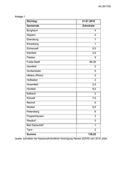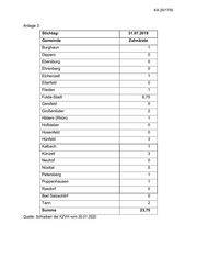 KA 20/1755 Anlage 3 Stichtag: 31.07.2019 Gemeinde Zahnärzte Burghaun 1 Dipperz 0 Ebersburg 0 Ehrenberg 0 Eichenzell 1 Eiterfeld 0 Flieden 1 Fulda-Stadt 6,75 Gersfeld 0 Großenlüder 2 Hilders (Rhön) 1 Hofbieber 0 Hosenfeld 0 Hünfeld 3 Kalbach 1 Künzell 3 Neuhof 0 Nüsttal 0 Petersberg 1 Poppenhausen 1 Rasdorf 0 Bad Salzschlirf 0 Tann 2 Summe 23,75 Quelle: Schreiben der KZVH vom 30.01.2020