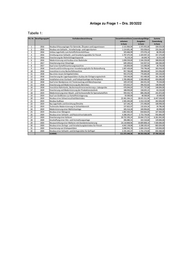 Anlage zu Frage 1 – Drs. 20/3222 Tabelle 1: lfd. Nr. Bewilligungsjahr Vorhabensbezeichnung Gesamtinvestitions- zuwendungsfähige Summe volumen Ausgaben Zuwendung in Euro in Euro in Euro 1 2016 Neubau Erfassungslager Für Getreide, Ölsaaten und Leguminosen 2.115.964,94 1.372.955,00 339.554,00 2 2016 Neubau von Schlacht-, Verarbeitungs- und Lagerräumen 1.114.601,48 933.058,61 233.264,00 3 2016 Umbau Lagerhalle zum Kartoffelkistenkühlhaus 325.666,99 273.576,14 68.392,60 4 2016 Errichtung einer Schlacht- und Verarbeitungsstätte für Fleisch 1.707.475,94 1.429.497,32 357.374,00 5 2016 Erweiterung der Rohmilchlagerkapazität 76.219,20 64.049,76 16.012,00 6 2016 Modernisierung und Ausbau einer Backstube 1.838.550,00 1.544.250,00 308.850,00 7 2017 Erweiterung einer Siloanlage 649.109,61 532.927,51 106.584,00 8 2017 Kauf einer Kartoffelsortierungsmaschine 136.850,00 115.000,00 28.750,00 9 2018 Erwerb und Einrichtung einer Verarbeitungshalle für Biolandhonig 1.007.420,00 759.796,00 303.918,00 10 2018 Investition in eine Becherfüllmaschine 957.760,00 789.840,00 315.936,00 11 2018 Bau eines neuen Zerlegebetriebes 955.575,95 776.605,00 194.150,00 12 2018 Erweiterung der Lagerkapazitäten-Ausbau der Einlagerungstechnik 539.546,00 453.400,00 181.360,00 13 2018 Installation einer Eierkoch- und Farbspritzanlage mit Peripherie 1.785.000,00 1.500.000,00 450.000,00 14 2018 Kauf einer Bandpresse mit Tresteraustrag und Maischepumpe 329.147,92 264.451,92 79.334,00 15 2018 Erweiterung und Modernisierung des Betriebes 672.615,37 496.352,63 148.904,00 16 2018 Investition Rahmtanks, Bechermaschinenerweiterung u. Laborgeräte 476.044,03 371.737,00 148.694,00 17 2019 Erweiterung und Modernisierung der Produktionstechnik 188.050,00 158.025,21 63.210,00 18 2019 Modernisierung einer Wasch- und Verlesestraße für Speisekartoffeln 959.432,74 806.246,00 241.872,00 19 2019 Kauf von Großkisten zur Kartoffeleinlagerung 59.500,00 48.500,00 19.400,00 20 2019 Neubau eines Schweineschlachtbetriebes 22.461.264,21 18.421.511,94 6.447.528,00 21 2019 Neubau Sudhaus 1.565.445,00 1.314.132,00 262.826,00 22 2019 Bau Lagerhalle und Einrichtung Ölmühle 327.246,24 272.496,84 108.998,00 23 2019 Technische Modernisierung im Schlachtbereich 157.822,97 132.624,34 39.786,00 24 2019 Modernisierung einer Mehlsiloanlage 305.514,28 249.994,85 49.998,00 25 2019 Neubau einer Metzgerei 1.802.463,30 818.663,05 327.464,00 26 2020 Neubau einer Schlacht- und Nutzviehverladestelle 4.288.293,47 2.733.734,06 956.806,00 27 2020 Erweiterung einer Kelterei 30.722.393,24 25.044.175,55 6.261.042,00 28 2020 Anschaffung einer Silo- und Vermahlungsanlage 396.080,31 322.510,60 129.004,00 29 2020 Neuausrichtung einer Molkerei mit Standorterweiterung 24.118.868,96 19.809.808,10 7.500.000,00 30 2020 Neubau eines Zerlege- und Verarbeitungsbetriebes für Fleisch 4.042.138,08 3.208.103,43 802.024,00 31 2020 Erweiterung von Silokapazitäten 3.098.943,76 2.604.154,42 520.830,00 32 2020 Neubau einer Schlacht- und Zerlegestätte für Geflügel 2.191.345,37 1.731.173,00 692.468,00 SUMME: 111.372.349,36 89.353.350,28 27.704.332,60