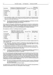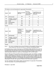 2 Hessischer Landtag · 20. Wahlperiode · Drucksache 20/2489 Studierende Studierende im Studienbereich Germanistik Hochschule Personal VZÄq pro Personal im WS2018 an staatlichen Hochschulen VZÄq 1 TU Darmstadt 391 U Frankfurt a.M. 1.988 83,5 23,8 U Gießen 1.318 46,1 28,6 U Kassel 1.241 44,6 27,8 U Marburg 1.154 69,5 16,6 1 Keine Personaldaten verfügbar, welche statistisch eine fachliche Zuordnung zur Germanistik aufweist. In der TUD ist dieses Personal dem LuF „Allgemeine und vergleichende Literatur- Sprachwissenschaft“ zugeordnet und nicht näher differenzierbar. Frage 2. Wie stellt sich die Betreuungsrelation von Lehrkräften zu Studentinnen und Studenten in den Lehr- amtsstudiengängen insbesondere nach Erhöhung der Studienplätze dar? Bitte aufschlüsseln nach Lehramt sowie Universität. Eine statistische Erfassung des Lehrkräfteeinsatzes aufgeschlüsselt auf einzelne Lehramtsstudien- gänge erfolgt in der amtlichen Statistik nicht. Deshalb erfolgte eine Abfrage von relevanten An- gaben zur Lehrkapazität (in VZÄq) des wissenschaftlich-künstlerischen Personals bei den einzel- nen Hochschulen bezogen auf die Lehramtsstudiengänge der jeweiligen Hochschulen. Das Ergebnis der Abfrage ist nachfolgend tabellarisch gegeben: Studierende an staatl. hess. Hoch- Studierende pro Hochschule schulen nach Lehrämtern und Uni- Personal VZÄq Personal VZÄq versitäten im Wintersemester 2018 TU Darmstadt 1.238 a U Frankfurt a.M. 6.202 b U Gießen 6.065 277,1 21,9 U Kassel 4.843 c U Marburg 2.386 83,4 28,6 Nicht alle Hochschulen konnten innerhalb der gesetzten Frist die erbetenen Angaben machen. Es wurde angeführt, dass a) das Lehrpersonal – aufgrund des Angebots verschiedenster Lehrveranstaltungen diverser Fä- cher – nicht eindeutig den Fächern im Lehramt zugeordnet werden kann; daher sei es nicht möglich, die entsprechenden Lehrkapazitäten zu berechnen; b) Lehrkapazitäten grundsätzlich nur in Bezug auf das Lehrdeputat angegeben werden können; c) die Betrachtung der Lehrkapazität in allen relevanten Prozessen über Lehrveranstaltungs- bzw. Semesterwochenstunden und nicht über VZÄq erfolgt. Frage 3. In welchen weiteren Studiengängen liegt die Teilnehmerzahl der Studentinnen und Studenten an Veranstaltungen deutlich oberhalb der jeweils vorgesehenen Kapazitätsverordnungen? Bitte aufschlüsseln nach Universität bzw. Hochschule. Das in der Verordnung über die Kapazitätsermittlung, die Curricularnormwerte und die Festset- zung von Zulassungszahlen (Kapazitätsverordnung - KapVO) vom 10. Januar 1994, zuletzt geän- dert durch Verordnung vom 20. Juni 2005 (GVBl. I S. 532), für alle Studiengänge gleich geregelte Modell zur Berechnung der Kapazität ist ein abstraktes Berechnungssystem, bei dem das Lehran- gebot und die Lehrnachfrage gegenübergestellt werden. Die Zugrundelegung bestimmter Grup- pengrößen für bestimmte Veranstaltungsarten dient daher allein der abstrakten Berechnung der Lehrnachfrage für einen bestimmten Studiengang. Frage 4. Wie viele der im Koalitionsvertrag genannten, mit einem kw-Vermerk versehenen, 129 Planstellen für Professorinnen und Professoren an den hessischen Hochschulen für Angewandte Wissenschaf- ten wurden bislang entfristet? Bitte jeweils nach Hochschule und Professur angeben. Im Nachtrag 2019 zum Haushalt 2018/2019 wurden die 129 kw-Vermerke herausgenommen, detailliertere Informationen sind in der nachfolgenden Tabelle dargelegt.