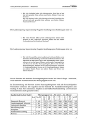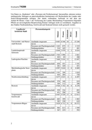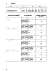 Landtag Mecklenburg-Vorpommern - 7. Wahlperiode Drucksache 7/6289 3. Wie viele Ausländer halten sich schätzungsweise illegal hier auf und sind nicht gemeldet (bitte auflisten nach Gebiet, Männer, Frauen und Diverse)? Wie viele Studenten halten sich schätzungsweise ohne Ummeldung hier auf und sind nicht gemeldet (bitte auflisten nach Gebiet, Männer, Frauen und Diverse)? Der Landesregierung liegen derartige Angaben beziehungsweise Schätzungen nicht vor. 4. Wie viele Personen haben jeweils schätzungsweise keinen festen Wohnsitz in den Landkreisen, kreisfreien Städten und den Städten Neubrandenburg, Greifswald und Stralsund? Der Landesregierung liegen derartige Angaben beziehungsweise Schätzungen nicht vor. 5. Wie viele Personen leben in den Landkreisen, kreisfreien Städten sowie den Städten Neubrandenburg, Greifswald und Stralsund inklusive aller Kategorien aus den Fragen 1 bis 4 (bitte auflisten nach Gebiet, Alters- kohorten mit je zehn Jahren, Männern mit deutscher Staatsangehörig- keit, Frauen mit deutscher Staatsangehörigkeit, Diverse mit deutscher Staatsangehörigkeit, Männern mit EU-Staatszugehörigkeit, Frauen mit EU-Staatszugehörigkeit, Diverse mit EU-Staatszugehörigkeit, Männer aus anderen Staaten, Frauen aus anderen Staaten und Diverse aus anderen Staaten)? Für die Personen mit deutscher Staatsangehörigkeit wird auf die Daten in Frage 1 verwiesen, in der ebenfalls die unterschiedlichen Altersgruppen erfasst sind. Im Zusammenhang mit Personen anderer Staatsangehörigkeiten wird auf die nachfolgenden Übersichten verwiesen. Die Angaben sind der Statistik des Ausländerzentralregisters zum Stichtag 30. Juni 2021 entnommen. Angaben zu den Städten Neubrandenburg, Greifswald und Stralsund können nicht gemacht werden. Landkreis/kreisfreie Stadt Altersgruppen von ... bis unter ... (in Jahren) k.A. bis 16 16 - 18 - 25 - 35 - 45 - 55 - ab 65 18 25 35 45 55 65 Hansestadt Rostock - 2 348 221 1 670 4 577 2 840 1 786 1 049 749 Landeshauptstadt Schwerin - 1 961 193 1 134 1 866 1 474 980 575 651 Ludwigslust-Parchim 2 186 204 1 455 3 059 2 600 1 998 885 310 Mecklenburgische - 1 839 215 1 001 2 038 1 600 1 099 668 349 Seenplatte Nordwestmecklenburg - 1 028 92 801 1 605 1 214 922 488 347 Rostock 1 1 454 156 945 1 943 1 667 1 229 613 270 3