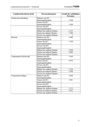 Drucksache 7/6289 Landtag Mecklenburg-Vorpommern - 7. Wahlperiode Um Daten zu „Studenten“ oder „Personen mit Freiheitsentzug“ darzustellen, müssten weitere umfangreiche Abfragen an unterschiedlichen Institutionen wie Hochschulen des Landes oder Justizvollzugsanstalten erfolgen. Der damit verbundene Aufwand ist mit dem aus Artikel 40 Absatz 1 Satz 1 der Verfassung des Landes Mecklenburg-Vorpommern folgenden Pflicht zur unverzüglichen Beantwortung Kleiner Anfragen nicht zu vereinbaren. Angaben zu den Städten Neubrandenburg, Greifswald und Stralsund können nicht gemacht werden. Landkreis/ Personenkategorie Unbekannt kreisfreie Stadt Männer Frauen Divers Gesamt Universitäts- und Hanse- Ausländer insgesamt 8 683 6 546 10 1 15 240 stadt Rostock davon Personen mit Fluchteigenschaft 1 442 875 2 - 2 319 Duldungsinhaber 316 165 - - 481 Landeshauptstadt Ausländer insgesamt 4 848 3 979 5 2 8 834 Schwerin davon Personen mit Fluchteigenschaft 1 564 1 096 1 - 2 661 Duldungsinhaber 203 85 - - 288 Ludwigslust-Parchim Ausländer insgesamt 7 668 5 016 13 - 12 697 davon Personen mit Fluchteigenschaft 650 451 - - 1 101 Duldungsinhaber 281 169 1 - 451 Mecklenburgische Seen- Ausländer insgesamt 4 997 3 810 2 0 8 809 platte davon Personen mit Fluchteigenschaft 1 101 709 - - 1 810 Duldungsinhaber 444 284 - - 728 Nordwestmecklenburg Ausländer insgesamt 3 677 2 815 4 1 6 497 davon Personen mit Fluchteigenschaft 570 349 - - 919 Duldungsinhaber 184 112 - - 296 Rostock Ausländer insgesamt 4 926 3 342 10 0 8 278 davon Personen mit Fluchteigenschaft 559 334 - - 893 Duldungsinhaber 451 298 - - 749 Vorpommern- Ausländer insgesamt 6 467 5 529 17 0 12 013 Greifswald davon Personen mit Fluchteigenschaft 683 399 1 - 1 083 Duldungsinhaber 382 228 - - 610 Vorpommern-Rügen Ausländer insgesamt 5 829 4 712 31 0 10 572 davon Personen mit Fluchteigenschaft 984 613 2 - 1 599 Duldungsinhaber 367 225 - - 592 2