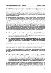 LANDTAG NORDRHEIN-WESTFALEN - 17. Wahlperiode Drucksache 17/15085 Grundsätzlich folgt aus einer sich rechnerisch ergebenden zu geringen Personalausstattung an einzelnen Schulen nicht notwendig, dass der Unterrichtsbedarf dieser Schule nicht gedeckt werden kann. Vielmehr kann die Schulaufsichtsbehörde vor Ort bestehende Besonderheiten (z. B. im Hinblick auf den Umfang von Alters- bzw. Schwerbehindertenermäßigungen) im Rah- men der Personalzuweisung berücksichtigen. Auf der anderen Seite bedeutet eine sich rech- nerisch ergebende zu hohe Personalausstattung an einzelnen Schulen nicht automatisch eine Überversorgung dieser Schule. Bei der Interpretation der Daten aus SchIPS ist ferner zu berücksichtigen, dass es sich hierbei um eine stichtagsbezogene Momentaufnahme handelt und die Unterrichtsversorgung einzel- ner Schulen daher nicht immer vollständig abgebildet werden kann. Alle sich noch in Bearbei- tung befindlichen Vorgänge, wie z. B. Veränderungen in der Personalzuweisung, Neueinstel- lungen, Pensionierungen, Beginn oder Beendigung von Erziehungsurlaub, Elternzeit oder Al- tersteilzeit, Beurlaubungen, Veränderungen im Beschäftigungsumfang können in einer stich- tagsbezogenen Abfrage nicht berücksichtigt werden. Ergänzend wird darauf hingewiesen, dass den Schulen landesweit zusätzliches Personal zur Verfügung steht, das in SchIPS nicht bei der Personalausstattung der jeweiligen Schule erfasst wurde. Hierzu zählen beispielsweise die Vertretungsreserve Grundschule, Lehrkräfte für den herkunftssprachlichen Unterricht oder Schulpsychologinnen und Schulpsychologen. Obwohl dieses Personal nicht bei der Personal- ausstattung der einzelnen Schule verbucht wurde, verbessert es deren Personalsituation. 2. Wie viele unbefristete Neueinstellungen gibt es im Schuljahr 2021/2022 im Kreis Viersen? (Bitte die absoluten Zahlen angeben und bitte zusätzlich nach Schulfor- men und Standorten aufschlüsseln mit der Angabe, wie viele der ausgeschriebe- nen Stellen bislang besetzt werden konnten) 4. Wie viele Seiteneinsteigerinnen und Seiteneinsteiger wurden für das Schuljahr 2021/22 in den Schulen im Kreis Viersen eingesetzt? (Bitte die absoluten Zahlen angeben und bitte zusätzlich aufschlüsseln nach Schulformen und Schulstandor- ten.) Aus Gründen des Sachzusammenhangs werden die Fragen 2 und 4 gemeinsam beantwortet. In Nordrhein-Westfalen werden Lehrkräfte nicht nur im Rahmen des Ausschreibungsverfah- rens, sondern auch im sog. Listenverfahren in den öffentlichen Schuldienst eingestellt. Die Zahl der zum Schuljahresbeginn 2021/22 unbefristeten Neueinstellungen und darunter diejenigen Lehrkräfte, die im Rahmen des Seiteneinstiegs eingestellt werden, ergibt sich aus der Anlage 2. 3. Wie stellt sich zum Stichtag 2. August 2021 die Besetzungssituation von Schullei- tungsstellen und stellvertretenden Schulleitungsstellen an den Schulen im Kreis Viersen dar? (Bitte die absoluten Zahlen angeben und bitte zusätzlich aufschlüs- seln nach Schulform, Standort, kommissarischer Beauftragung, Bewertung der Stelle und tatsächlicher Besoldungsgruppe des/der Stelleninhabers/in, Anzahl der Stellenausschreibungen sowie ausweisen, seit wann die Stelle nicht besetzt ist) Die Besetzungssituation bei den Schulleitungs- und Stellvertretungsstellen ergibt sich aus der Anlage 3a, die Bewertung der Schulleitungsämter in Nordrhein-Westfalen aus der Anlage 3b. Eine rückwirkende Erhebung der Besetzungssituation zum 02.08.2021 ist nicht möglich; die Erhebung erfolgte somit zum Stichtag 12.08.2021. Die Angabe der individuellen Besoldung 3