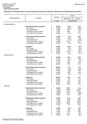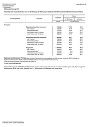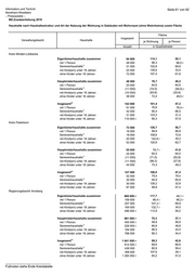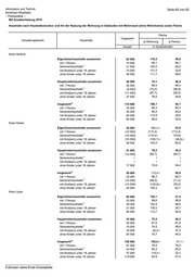 Information und Technik Seite 67 von 92 Nordrhein-Westfalen – Pressestelle – MZ-Zusatzerhebung 2010 Haushalte nach Art der Nutzung der Wohnung in Gebäuden mit Wohnraum (ohne Wohnheime) in NRW 2) 2) Insgesamt Eigentümerhaushalte Mieterhaushalte Eigentümerhaushalte Mieterhaushalte Haushalte Anzahl in Prozent Insgesamt 8 162 000 3 459 000 4 703 000 42,4 57,6 mit 1 Person 3 145 000 855 000 2 290 000 27,2 72,8 1) Seniorenhaushalte 2 045 000 1 067 000 978 000 52,2 47,8 mit Kind(ern) unter 18 Jahren 1 738 000 837 000 902 000 48,1 51,9 ohne Kinder unter 18 Jahren 6 424 000 2 622 000 3 802 000 40,8 59,2 in Gemeinden von … bis unter ... Einwohner unter 10.000 172 000 129 000 43 000 75,2 24,8 10.000 bis unter 20.000 758 000 468 000 289 000 61,8 38,2 unter 20.000 929 000 598 000 332 000 64,3 35,7 20.000 bis unter 50.000 1 819 000 1 007 000 812 000 55,4 44,6 50.000 bis unter 100.000 1 464 000 694 000 770 000 47,4 52,6 100.000 bis unter 200.000 918 000 r 340 000 r 578 000 r 37,0 r 63,0 r 200.000 bis unter 500.000 1 653 000 r 492 000 r 1 161 000 r 29,7 r 70,3 r 500.000 und mehr 1 379 000 r 329 000 r 1 050 000 r 23,9 r 76,1 r Ergebnisse des Mikrozensus. Für Haushalte wurde der Standardhochrechnungsfaktor des Mikrozensus verwendet. 1) Alle Haushaltsmitglieder sind mindestens 65 Jahre alt. 2) einschließlich Untermieterhaushalte