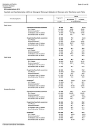 Information und Technik Seite 68 von 92 Nordrhein-Westfalen – Pressestelle – MZ-Zusatzerhebung 2010 Haushalte nach Art der Nutzung der Wohnung in Gebäuden mit Wohnraum (ohne Wohnheime) 2) 2) Insgesamt Eigentümerhaushalte Mieterhaushalte Eigentümerhaushalte Mieterhaushalte Verwaltungsbezirk Haushalte Anzahl in Prozent Nordrhein-Westfalen Insgesamt 8 161 000 r 3 462 000 r 4 699 000 r 42,4 57,6 mit 1 Person 3 143 000 r 854 000 r 2 289 000 r 27,2 72,8 1) Seniorenhaushalte 2 046 000 r 1 069 000 r 977 000 r 52,2 47,8 mit Kind(ern) unter 18 Jahren 1 738 000 r 838 000 r 899 000 r 48,3 51,7 ohne Kinder unter 18 Jahren 6 424 000 r 2 624 000 r 3 800 000 r 40,8 59,2 Regierungsbezirk Düsseldorf Zusammen 2 427 000 r 894 000 r 1 533 000 r 36,8 63,2 mit 1 Person 974 000 r 226 000 749 000 r 23,2 r 76,8 r 1) Seniorenhaushalte 621 000 276 000 345 000 r 44,4 55,6 mit Kind(ern) unter 18 Jahren 490 000 r 203 000 287 000 41,5 r 58,5 r ohne Kinder unter 18 Jahren 1 937 000 r 691 000 r 1 246 000 r 35,7 64,3 Stadt Düsseldorf Zusammen 305 000 60 000 245 000 19,7 80,3 mit 1 Person 151 000 r 19 000 133 000 12,2 87,8 1) Seniorenhaushalte 64 000 17 000 47 000 26,5 73,5 mit Kind(ern) unter 18 Jahren 55 000 (14 000) 41 000 (25,7) 74,3 ohne Kinder unter 18 Jahren 250 000 46 000 204 000 18,3 81,7 Stadt Duisburg Zusammen 227 000 55 000 172 000 24,1 75,9 mit 1 Person 93 000 (13 000) 79 000 (14,5) 85,5 1) Seniorenhaushalte 59 000 15 000 44 000 25,6 r 74,4 r mit Kind(ern) unter 18 Jahren 46 000 (14 000) 33 000 (29,2) r 70,8 r ohne Kinder unter 18 Jahren 180 000 41 000 139 000 22,7 77,3 Stadt Essen Zusammen 279 000 67 000 211 000 r 24,1 75,9 mit 1 Person 122 000 20 000 102 000 16,3 83,7 Seniorenhaushalte1) 77 000 22 000 55 000 28,3 r 71,7 r mit Kind(ern) unter 18 Jahren 49 000 (13 000) 36 000 (26,7) 73,3 ohne Kinder unter 18 Jahren 230 000 54 000 176 000 23,5 76,5 Stadt Krefeld Zusammen 114 000 45 000 68 000 r 39,8 r 60,2 r mit 1 Person 48 000 (13 000) 35 000 r (26,4) r 73,6 r 1) Seniorenhaushalte 29 000 (14 000) (14 000) (50,2) (49,8) mit Kind(ern) unter 18 Jahren 24 000 (11 000) (13 000) (46,0) r (54,0) r ohne Kinder unter 18 Jahren 90 000 34 000 56 000 38,1 r 61,9 r Stadt Mönchengladbach Zusammen 125 000 53 000 72 000 42,3 57,7 mit 1 Person 49 000 (15 000) 35 000 (29,8) 70,2 1) Seniorenhaushalte 33 000 18 000 (15 000) 55,2 (44,8) mit Kind(ern) unter 18 Jahren 26 000 (11 000) (14 000) (44,2) (55,8) ohne Kinder unter 18 Jahren 99 000 41 000 58 000 41,8 58,2 __________________________ Fußnoten siehe Ende Kreistabelle