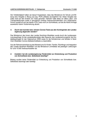LANDTAG NORDRHEIN-WESTFALEN - 17. Wahlperiode Drucksache 17/14300 Der Vollständigkeit halber sei darauf hingewiesen, dass das Ministerium für Schule und Bil- dung eine Vergabe in Bezug auf sog. PCR-Lollitests durchgeführt hat. Diese Vergabe war indes nicht auf den Erwerb von Tests gerichtet. Vielmehr hatte diese vor allem Labor- und Transportleistungen sowie in geringerem Umfang Verbrauchsmaterialien zum Gegenstand. Ferner handelt es sich bei diesen PCR-Tests nicht um Schnelltests, auf die die Kleine Anfrage ausweislich deren Vorbemerkung abzielt. 4. Durch wen konnten bzw. können Corona-Tests aus den Kontingenten der Landes- regierung abgerufen werden? Das Ministerium des Innern des Landes Nordrhein-Westfalen wurde durch die Landesregie- rung beauftragt, für die Landesbediensteten aller Ressorts, den Landesrechnungshof, die Lan- desbeauftragte für den Datenschutz NRW sowie für die Schülerinnen und Schüler in Nord- rhein-Westfalen Corona-Selbstschnelltests zu beschaffen. Aus der Rahmenvereinbarung des Ministeriums für Kinder, Familie, Flüchtlinge und Integration des Landes Nordrhein-Westfalen ruft das Ministerium unmittelbar die jeweiligen Lieferungen für rund 10.000 Verbrauchsstellen ab. 5. Inwiefern hat die Landesregierung Fördermittel zur Entwicklung und Produktion von Schnelltests bzw. Selbsttests bewilligt? Bislang wurden keine Fördermittel zur Entwicklung und Produktion von Schnelltests bzw. Selbsttests beantragt oder bewilligt. 3