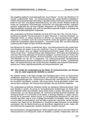 LANDTAG NORDRHEIN-WESTFALEN - 17. Wahlperiode Drucksache 17/15002 In Bezug auf die spezifischen Arbeiten zum Kinder- und Jugendmedienschutz wird auf die Antwort zur Frage 101 verwiesen. 385. Welche konkreten Informations- und Bildungsmaßnahmen zu Fragen des Verbrau- cherschutzes und der Verbrauchersicherheit im digitalen Raum förderte die Lan- desregierung seit 2017 bzw. führte sie durch? (Bitte einzeln aufführen) Die Internet- und Informationssicherheit von Verbraucherinnen und Verbrauchern in der digi- talen Welt zu steigern, ihnen beim Umgang mit Missbrauch zur Seite zu stehen und Internets- abotage wirksam zu bekämpfen, ist für die Landesregierung Nordrhein-Westfalen von zentra- ler Bedeutung. Maßnahmen zum Verbraucherschutz orientieren sich daher an den Zielen Schutz der Gesundheit, Sicherheit und Interessen der Verbraucherinnen und Verbraucher. Zur Steigerung der Informationssicherheit der Bevölkerung haben die Verbraucherzentrale Nordrhein-Westfalen und das Bundesamt für Sicherheit in der Informationstechnik (BSI) eine Kooperationsvereinbarung abgeschlossen, um durch gemeinsame Aktionen präventiv gegen mögliche Verstöße im Bereich des Verbraucherschutzes vorzugehen. Mit Angeboten wie dem „Phishing-Radar“, „Post-Ärger“, „IGEL-Ärger“ und aktuellen Informationen auf der Webseite der Verbraucherzentrale Nordrhein-Westfalen stehen zahlreiche Informationen, Bildungs- und Selbsthilfetools zu Problemen im analogen und digitalen Verbraucheralltag zur Verfügung. Er- gänzend bieten ausgewählte Beratungsstellen der Verbraucherzentrale Nordrhein-Westfalen (derzeit 21) Verbraucherberatung zum Datenschutz in der digitalen Welt an. Ziel polizeilicher kriminalpräventiver Maßnahmen ist es, die Bevölkerung, Wirtschaft, Ver- bände, öffentliche Verwaltung und andere Aufgabentragende zu sicherheitsbewusstem Ver- halten zu veranlassen, sowie potenzielle Täterinnen und Täter von der Begehung von Strafta- ten abzuhalten und so die Anzahl von Straftaten und Opfern zu verringern. Die Grundlage des kriminalpräventiven Handelns ist der Runderlass „Polizeiliche Kriminalprävention“ des Minis- teriums des Innern des Landes Nordrhein-Westfalen vom 9. Mai 2019. Im Rahmen dieses Er- lasses führt die Polizei Nordrhein-Westfalen Maßnahmen der allgemeinen Prävention und auch Maßnahmen der Prävention im digitalen Raum durch. In jeder Kreispolizeibehörde neh- men besonders geschulte Polizeibeamtinnen und Polizeibeamte Aufgaben der Prävention in den Kriminalkommissariaten, Kriminalprävention und Opferschutz und den für Kriminalpräven- tion und Opferschutz zuständigen Organisationseinheiten wahr. Das Landeskriminalamt Nordrhein-Westfalen unterstützt die Polizeibehörden bei der polizeili- chen Kriminalprävention gemäß § 13 Absatz 2 Nummer 2 des Polizeiorganisationsgesetzes des Landes Nordrhein-Westfalen, indem es insbesondere zentrale Aufgaben der Erstellung von Fachkonzepten und Kampagnen wahrnimmt und deren Umsetzung koordiniert. In diesem Zusammenhang stellt das Landeskriminalamt Nordrhein-Westfalen den 47 Kreispolizeibehör- den für präventive Aktivitäten im Zusammenhang mit Verbraucherschutz und -sicherheit aktu- elle Informationen zur Verfügung. Beispielhaft werden die nachstehenden Projekte und Kampagnen benannt: 1. Das Fachkonzept zum Thema „Fakeshops“ wird im Rahmen der landesweiten Präven- tionskampagne „Achtung! Täuschend echt!“ betrieben. Hierzu weiteten die Verbraucher- zentrale Nordrhein-Westfalen und das Landeskriminalamt Nordrhein-Westfalen ihre be- reits bestehende Kooperation aus und entwickelten spezifische Präventionsmaßnahmen zur Thematik „Fakeshops“, die auf den Webseiten der vorher genannten Institutionen ver- öffentlicht wurden. Weiterhin kooperiert das Landeskriminalamt Nordrhein-Westfalen mit 277
