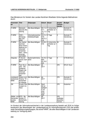 LANDTAG NORDRHEIN-WESTFALEN - 17. Wahlperiode Drucksache 17/15002 Das Ministerium für Verkehr des Landes Nordrhein-Westfalen führte folgende Maßnahmen durch: Veranstal- Titel Zielgruppe Datum Dauer Anzahl Budget ter Teilneh- mende IT.NRW Netzwerk Alle Beschäftigten 09.11.2 7 Unterrichts- 1 Zentrale Fi- Security Mo- 017 - einheiten an 1 nanzierung nitoring 10.11.2 Tag 017 IT.NRW CISO – Informationssicher- 22.01.2 5 Tage 2 Zentrale Fi- Schulung heitsbeauftragte 018 - nanzierung des CIO 26.01.2 NRW 018 IT.NRW Die Hacker Alle Beschäftigten 23.03.2 3 Unterrichts- 63 Zentrale Fi- kommen 019 einheiten an 1 nanzierung (Eine Veran- Tag staltung zur Informati- onssicher- heit) – Schu- lung des CIO NRW Integrata IT-Grund- Systemadministra- 19.10.2 2 Tage 6 6.704,80 Euro schutz nach toren 020 - BSI 20.10.2 020 IT.NRW Flyer Na si- Alle Beschäftigten ab 278 973,51 Euro cher - Die 2017 Goldenen Regeln der Informati- onssicher- heit Landesprä- Videos zum Alle Beschäftigten ab 278 Zentrale Fi- ventionsrat Thema: "IT- 2017 nanzierung NRW Sicherheit" im Intranet VM Emails/ War- Alle Beschäftigten Nach 278 Kostenlos nungen ins der je- Haus weiligen IT-Si- cher- heits- lage Städte- und BITS - Be- Alle Beschäftigten ab 278 Gemeinde- hörden-IT- 2017 (selbstge- bundes Sicherheits- steuertes NRW training Lernen) Im Kontext der Informationssicherheit in der Landesverwaltung besteht seit 2016 im Aufga- benbereich des Beauftragten der Landesregierung für Informationstechnik (CIO) die landes- weite Sensibilisierungskampagne „Na sicher! NRW“, die allen Beschäftigten in der Landesver- waltung zur Verfügung steht. 284