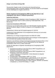 Anlage I zu der Kleinen Anfrage 5485 Die gemachten Angaben wurden mit Ausnahme der Unkenntlichmachung personenbezogener Daten unverändert aufgeführt. Es wird keine Gewähr für die Richtigkeit und die Vollständigkeit der Angaben übernommen. Welche Angebote der EnergieAgentur.NRW hat die Stadt Herne in den vergangenen zwei Jahren in Anspruch genommen? Auskunft der Stadt Herne: Teilnahme Klima.Netzwerk südwestfalen (Initiator EnergieAgentur NRW), Teilnahme an Online Veranstaltungen (Input PV, Wärme, Sanierung, Fördermöglichkeiten, THG- Bilanzierung) Auskunft der EnergieAgentur.NRW GmbH: 50 Personen aus der Stadtverwaltung haben per E-Mail Newsletter-Angebote (EA.News, fachliche Rundbriefe, Magazin innovation & energie etc.) der EnergieAgentur.NRW abonniert. Initialberatung im Rahmen des AK Energiemanagement (21.05.2019) Initialberatung Fördermöglichkeiten für die energieeffiziente Sanierung von kommunalen Schwimmbädern (2019) Initialberatung zum (Energie-)managementsystem Kom.EMS (08.12.2020) Qualifizierungsprozess für die Klimaschutzsiedlung Herne-Sodingen mit Statusvergabe am 30.10.2019 durch die Auswahlkommission des Landes Teilnahme an den jährlichen Umfragen bei Energieversorgungsunternehmen (EVU) zu ihren Förderprogrammen und Aufnahme in die EVU-Förderübersicht auf der Website der EnergieAgentur.NRW mit bis zu sieben Förderungen Vertreter der Stadt haben an folgenden Veranstaltungen der EnergieAgentur.NRW teilgenommen: Kooperationsveranstaltung mit dem Öko-Zentrum NRW "Energieeffizienz und Klimaschutz in Kommunen" (24.04.2020) Kooperationsveranstaltung mit dem Öko-Zentrum NRW "Energieeffizienz und Klimaschutz in Kommunen" (23.04.2021) "Lokaler Klimaschutz und Energiewende - Mit den Menschen ins Gespräch kommen" (14.09.2020) Kompetenztreffen "Elektromobilität in NRW" (19.11.2019) Info-Veranstaltung zum Förderprogramm "Ladeinfrastruktur vor Ort" (26.04.2021) Online-Informationsveranstaltung: KWK.NRW regional im Regierungsbezirk Arnsberg - Informationsveranstaltung zur KWK in Industrie, Handwerk und Gewerbe; in Kooperation u.a. mit der IHK Arnsberg (11.11.2020)