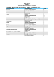 Große Anfrage 2 Anlage Nr. 80 Antwort zu Frage 3 und 5 im Bereich II. Einzelfragen Straftäter „gefährlicher/verrufener Ort“ Hagen 1 für das Jahr 2016 Staatsangehörigkeit Aufenthaltsanlass Anzahl Tunesien sonstiger erlaubter Aufenthalt 8 unerlaubter Aufenthalt 2 Arbeitnehmer 1 Asylbewerber 1 Türkei Schüler 3 sonstiger erlaubter Aufenthalt 56 Arbeitnehmer 14 Asylbewerber 1 Duldung (z.B. abgelehnte Asylbewerber) 1 Gewerbetreibender 1 Turkmenistan Asylbewerber 1 Ukraine sonstiger erlaubter Aufenthalt 3 Tourist/Durchreisender 2 Ungarn sonstiger erlaubter Aufenthalt 3 Ungeklärt sonstiger erlaubter Aufenthalt 11 Asylbewerber 5 unerlaubter Aufenthalt 1 Vereinigte Arabische Emirate sonstiger erlaubter Aufenthalt 1 Asylbewerber 1 Vereinigte Staaten von Amerika (USA) Student 1 sonstiger erlaubter Aufenthalt 1 Vietnam sonstiger erlaubter Aufenthalt 1 Tourist/Durchreisender 2