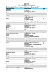 Große Anfrage 2 Anlage Nr. 82 Antwort zu Frage 3 und 5 im Bereich II. Einzelfragen Straftäter „gefährlicher/verrufener Ort“ Hagen 2 für das Jahr 2017 Staatsangehörigkeit Aufenthaltsanlass Anzahl Deutschland 133 Albanien Asylbewerber 1 Algerien Asylbewerber 8 sonstiger erlaubter Aufenthalt 5 unerlaubter Aufenthalt 3 Duldung (z.B. abgelehnte Asylbewerber) 2 Armenien sonstiger erlaubter Aufenthalt 2 Asylbewerber 1 Aserbaidschan sonstiger erlaubter Aufenthalt 1 Belgien sonstiger erlaubter Aufenthalt 1 Bulgarien sonstiger erlaubter Aufenthalt 6 Arbeitnehmer 2 Tourist/Durchreisender 1 International/national Schutzberechtigte und Eritrea Asylberechtigte 1 Frankreich sonstiger erlaubter Aufenthalt 1 Georgien Tourist/Durchreisender 2 Griechenland Gewerbetreibender 1 sonstiger erlaubter Aufenthalt 1 Guinea Duldung (z.B. abgelehnte Asylbewerber) 3 Asylbewerber 8 Indien (einschl. Sikkim) sonstiger erlaubter Aufenthalt 1 Irak Asylbewerber 3 sonstiger erlaubter Aufenthalt 1 Iran Islamische Republik Asylbewerber 1 sonstiger erlaubter Aufenthalt 1 Kongo, Demokratische Republik (früher Zaire) sonstiger erlaubter Aufenthalt 1 Kosovo sonstiger erlaubter Aufenthalt 2 Kroatien sonstiger erlaubter Aufenthalt 2 Libanon Duldung (z.B. abgelehnte Asylbewerber) 2 Asylbewerber 2 Marokko Asylbewerber 5 sonstiger erlaubter Aufenthalt 4 unerlaubter Aufenthalt 2 Nigeria Duldung (z.B. abgelehnte Asylbewerber) 1 unerlaubter Aufenthalt 1 Tourist/Durchreisender 1 sonstiger erlaubter Aufenthalt 1 Polen sonstiger erlaubter Aufenthalt 9 Portugal sonstiger erlaubter Aufenthalt 2 Rumänien sonstiger erlaubter Aufenthalt 10 Serbien sonstiger erlaubter Aufenthalt 3 Asylbewerber 1 Somalia unerlaubter Aufenthalt 1 Sri Lanka Asylbewerber 1 International/national Schutzberechtigte und Syrien Arabische Republik Asylberechtigte 1 sonstiger erlaubter Aufenthalt 1 Asylbewerber 7 Duldung (z.B. abgelehnte Asylbewerber) 1 Tschechische Republik (Tschechien) sonstiger erlaubter Aufenthalt 1 Tunesien sonstiger erlaubter Aufenthalt 1 unerlaubter Aufenthalt 1 Türkei sonstiger erlaubter Aufenthalt 3