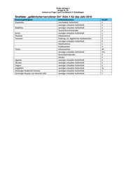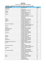 Große Anfrage 2 Anlage Nr. 83 Antwort zu Frage 3 und 5 im Bereich II. Einzelfragen Straftäter „gefährlicher/verrufener Ort“ Köln 1 für das Jahr 2010 Staatsangehörigkeit Aufenthaltsanlass Anzahl Kasachstan sonstiger erlaubter Aufenthalt 2 Kenia Arbeitnehmer 1 sonstiger erlaubter Aufenthalt 2 Kolumbien unerlaubter Aufenthalt 1 Kongo, Republik sonstiger erlaubter Aufenthalt 8 Kosovo Asylbewerber 1 Arbeitnehmer 3 sonstiger erlaubter Aufenthalt 1 Kroatien sonstiger erlaubter Aufenthalt 4 unerlaubter Aufenthalt 1 Schüler 3 Arbeitnehmer 1 Lettland Tourist/Durchreisender 1 sonstiger erlaubter Aufenthalt 1 Libanon sonstiger erlaubter Aufenthalt 1 Libyen sonstiger erlaubter Aufenthalt 2 Litauen sonstiger erlaubter Aufenthalt 4 Tourist/Durchreisender 2 Marokko sonstiger erlaubter Aufenthalt 11 Arbeitnehmer 2 Duldung z.B. abgelehnte Asylbewerber 1 Asylbewerber 1 Mexiko Tourist/Durchreisender 1 Niederlande sonstiger erlaubter Aufenthalt 1 Tourist/Durchreisender 1 Nigeria sonstiger erlaubter Aufenthalt 4 Arbeitnehmer 1 unerlaubter Aufenthalt 1 Österreich Tourist/Durchreisender 1 Peru sonstiger erlaubter Aufenthalt 1 Polen Tourist/Durchreisender 2 sonstiger erlaubter Aufenthalt 12 Gewerbetreibender 1 Schüler 1 Portugal Arbeitnehmer 2 sonstiger erlaubter Aufenthalt 2 Schüler 1 Rumänien sonstiger erlaubter Aufenthalt 8 Tourist/Durchreisender 6 Russische Föderation sonstiger erlaubter Aufenthalt 1 Duldung z.B. abgelehnte Asylbewerber 1 Schweden sonstiger erlaubter Aufenthalt 1 Serbien sonstiger erlaubter Aufenthalt 9 Asylbewerber 2 Duldung z.B. abgelehnte Asylbewerber 3 Arbeitnehmer 4 Schüler 2 Tourist/Durchreisender 1 Simbabwe sonstiger erlaubter Aufenthalt 1 Somalia sonstiger erlaubter Aufenthalt 3 Spanien Tourist/Durchreisender 2 sonstiger erlaubter Aufenthalt 3 Sri Lanka sonstiger erlaubter Aufenthalt 1