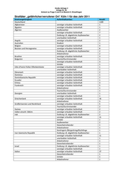 Große Anfrage 2 Anlage Nr. 84 Antwort zu Frage 3 und 5 im Bereich II. Einzelfragen Straftäter „gefährlicher/verrufener Ort“ Köln 1 für das Jahr 2011 Staatsangehörigkeit Aufenthaltsanlass Anzahl Jamaika sonstiger erlaubter Aufenthalt 1 Jordanien Schüler 1 Kamerun Asylbewerber 1 Kasachstan sonstiger erlaubter Aufenthalt 2 Kenia sonstiger erlaubter Aufenthalt 5 Kongo, Demokratische Republik früher Zaire sonstiger erlaubter Aufenthalt 3 Asylbewerber 1 Schüler 1 Kongo, Republik sonstiger erlaubter Aufenthalt 10 Korea Demokratische Volksrepublik sonstiger erlaubter Aufenthalt 2 Kosovo sonstiger erlaubter Aufenthalt 3 Arbeitnehmer 1 Kroatien unerlaubter Aufenthalt 1 sonstiger erlaubter Aufenthalt 8 Kuba sonstiger erlaubter Aufenthalt 2 Kuwait sonstiger erlaubter Aufenthalt 1 Lettland sonstiger erlaubter Aufenthalt 3 Libanon Asylbewerber 1 Liberia sonstiger erlaubter Aufenthalt 1 Schüler 1 Libysch Arabische Dschamahirija Libyen sonstiger erlaubter Aufenthalt 2 Litauen sonstiger erlaubter Aufenthalt 2 Makedonien Mazedonien sonstiger erlaubter Aufenthalt 2 Mali sonstiger erlaubter Aufenthalt 1 Marokko sonstiger erlaubter Aufenthalt 19 Arbeitnehmer 4 Duldung z.B. abgelehnte Asylbewerber 5 unerlaubter Aufenthalt 1 Asylbewerber 1 Montenegro sonstiger erlaubter Aufenthalt 2 Niederlande sonstiger erlaubter Aufenthalt 4 Tourist/Durchreisender 3 Nigeria sonstiger erlaubter Aufenthalt 2 Polen sonstiger erlaubter Aufenthalt 8 Tourist/Durchreisender 2 Gewerbetreibender 1 Portugal sonstiger erlaubter Aufenthalt 1 Rumänien sonstiger erlaubter Aufenthalt 12 Tourist/Durchreisender 10 Schüler 1 Arbeitnehmer 1 unerlaubter Aufenthalt 1 Russische Föderation Russland sonstiger erlaubter Aufenthalt 7 Schweiz Tourist/Durchreisender 1 Serbien sonstiger erlaubter Aufenthalt 18 Duldung z.B. abgelehnte Asylbewerber 4 Tourist/Durchreisender 1 Arbeitnehmer 1 Slowenien unerlaubter Aufenthalt 4 sonstiger erlaubter Aufenthalt 3 Spanien sonstiger erlaubter Aufenthalt 4 Tschechische Republik Tschechien sonstiger erlaubter Aufenthalt 2 unerlaubter Aufenthalt 1