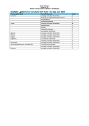 Große Anfrage 2 Anlage Nr. 84 Antwort zu Frage 3 und 5 im Bereich II. Einzelfragen Straftäter „gefährlicher/verrufener Ort“ Köln 1 für das Jahr 2011 Staatsangehörigkeit Aufenthaltsanlass Anzahl Tunesien sonstiger erlaubter Aufenthalt 17 Duldung z.B. abgelehnte Asylbewerber 5 Arbeitnehmer 1 Gewerbetreibender 1 Türkei sonstiger erlaubter Aufenthalt 96 Arbeitnehmer 9 Schüler 4 Gewerbetreibender 3 unerlaubter Aufenthalt 1 Uganda sonstiger erlaubter Aufenthalt 1 Ukraine sonstiger erlaubter Aufenthalt 4 Ungarn sonstiger erlaubter Aufenthalt 3 Ungeklärt unerlaubter Aufenthalt 1 sonstiger erlaubter Aufenthalt 3 Venezuela sonstiger erlaubter Aufenthalt 1 Vereinigte Staaten von Amerika USA Tourist/Durchreisender 3 sonstiger erlaubter Aufenthalt 5 Vietnam sonstiger erlaubter Aufenthalt 2