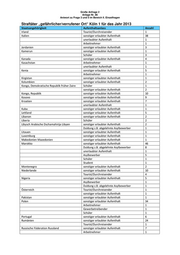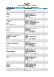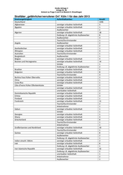Große Anfrage 2 Anlage Nr. 85 Antwort zu Frage 3 und 5 im Bereich II. Einzelfragen Straftäter „gefährlicher/verrufener Ort“ Köln 1 für das Jahr 2012 Staatsangehörigkeit Aufenthaltsanlass Anzahl Schüler 6 Arbeitnehmer 1 Kosovo sonstiger erlaubter Aufenthalt 10 unerlaubter Aufenthalt 1 Arbeitnehmer 3 Schüler 1 Kroatien sonstiger erlaubter Aufenthalt 4 unerlaubter Aufenthalt 1 Kuba sonstiger erlaubter Aufenthalt 1 Tourist/Durchreisender 2 Lettland sonstiger erlaubter Aufenthalt 2 Libanon sonstiger erlaubter Aufenthalt 1 Liberia Schüler 1 sonstiger erlaubter Aufenthalt 1 Libysch Arabische Dschamahirija Libyen sonstiger erlaubter Aufenthalt 2 Duldung z.B. abgelehnte Asylbewerber 1 unerlaubter Aufenthalt 1 Litauen sonstiger erlaubter Aufenthalt 1 Makedonien Mazedonien sonstiger erlaubter Aufenthalt 1 Marokko sonstiger erlaubter Aufenthalt 20 Asylbewerber 4 Student 1 Duldung z.B. abgelehnte Asylbewerber 4 unerlaubter Aufenthalt 4 Mexiko Student 1 Montenegro sonstiger erlaubter Aufenthalt 3 Niederlande sonstiger erlaubter Aufenthalt 7 Gewerbetreibender 2 Nigeria sonstiger erlaubter Aufenthalt 1 Asylbewerber 1 Österreich sonstiger erlaubter Aufenthalt 2 Pakistan sonstiger erlaubter Aufenthalt 1 Peru Schüler 1 Polen sonstiger erlaubter Aufenthalt 15 Gewerbetreibender 1 Arbeitnehmer 2 Rumänien sonstiger erlaubter Aufenthalt 25 Tourist/Durchreisender 2 Asylbewerber 1 Russische Föderation Russland sonstiger erlaubter Aufenthalt 3 unerlaubter Aufenthalt 1 Saudi Arabien sonstiger erlaubter Aufenthalt 3 Schweden sonstiger erlaubter Aufenthalt 1 Schweiz sonstiger erlaubter Aufenthalt 1 Senegal sonstiger erlaubter Aufenthalt 1 Serbien Schüler 1 sonstiger erlaubter Aufenthalt 15 Duldung z.B. abgelehnte Asylbewerber 2 Sierra Leone sonstiger erlaubter Aufenthalt 1 Simbabwe sonstiger erlaubter Aufenthalt 1 Slowenien sonstiger erlaubter Aufenthalt 1 Somalia sonstiger erlaubter Aufenthalt 1 Arbeitnehmer 1