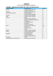 Große Anfrage 2 Anlage Nr. 85 Antwort zu Frage 3 und 5 im Bereich II. Einzelfragen Straftäter „gefährlicher/verrufener Ort“ Köln 1 für das Jahr 2012 Staatsangehörigkeit Aufenthaltsanlass Anzahl Spanien sonstiger erlaubter Aufenthalt 2 Tourist/Durchreisender 1 Südafrika sonstiger erlaubter Aufenthalt 1 Syrien Arabische Republik Gewerbetreibender 1 sonstiger erlaubter Aufenthalt 2 Thailand sonstiger erlaubter Aufenthalt 1 Togo sonstiger erlaubter Aufenthalt 1 Tunesien Student 1 sonstiger erlaubter Aufenthalt 12 Duldung z.B. abgelehnte Asylbewerber 3 Arbeitnehmer 1 unerlaubter Aufenthalt 4 Asylbewerber 3 Tourist/Durchreisender 1 Türkei sonstiger erlaubter Aufenthalt 127 Arbeitnehmer 10 Gewerbetreibender 4 Schüler 1 Ukraine sonstiger erlaubter Aufenthalt 1 Ungarn sonstiger erlaubter Aufenthalt 2 Tourist/Durchreisender 1 Ungeklärt Gewerbetreibender 2 unerlaubter Aufenthalt 1 sonstiger erlaubter Aufenthalt 3 Venezuela Schüler 1 Vereinigte Staaten von Amerika USA sonstiger erlaubter Aufenthalt 2