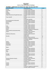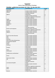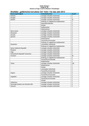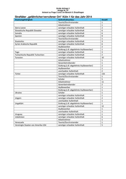 Große Anfrage 2 Anlage Nr. 87 Antwort zu Frage 3 und 5 im Bereich II. Einzelfragen Straftäter „gefährlicher/verrufener Ort“ Köln 1 für das Jahr 2014 Staatsangehörigkeit Aufenthaltsanlass Anzahl Tourist/Durchreisender 1 Arbeitnehmer 1 Sierra Leone sonstiger erlaubter Aufenthalt 2 Slowakische Republik Slowakei sonstiger erlaubter Aufenthalt 6 Somalia sonstiger erlaubter Aufenthalt 6 Spanien sonstiger erlaubter Aufenthalt 9 Tourist/Durchreisender 1 Staatenlos sonstiger erlaubter Aufenthalt 3 Syrien Arabische Republik sonstiger erlaubter Aufenthalt 6 Asylbewerber 2 Duldung (z.B. abgelehnte Asylbewerber) 1 Togo sonstiger erlaubter Aufenthalt 3 Tschechische Republik Tschechien sonstiger erlaubter Aufenthalt 2 Tunesien sonstiger erlaubter Aufenthalt 10 Arbeitnehmer 1 Gewerbetreibender 1 Duldung (z.B. abgelehnte Asylbewerber) 2 Asylbewerber 1 unerlaubter Aufenthalt 2 Türkei sonstiger erlaubter Aufenthalt 116 Tourist/Durchreisender 1 Schüler 5 Arbeitnehmer 11 Gewerbetreibender 2 Asylbewerber 1 Duldung (z.B. abgelehnte Asylbewerber) 1 Ukraine Schüler 1 sonstiger erlaubter Aufenthalt 1 Ungarn sonstiger erlaubter Aufenthalt 2 unerlaubter Aufenthalt 1 Ungeklärt Duldung (z.B. abgelehnte Asylbewerber) 1 sonstiger erlaubter Aufenthalt 12 Asylbewerber 1 unerlaubter Aufenthalt 1 Uruguay sonstiger erlaubter Aufenthalt 1 Usbekistan sonstiger erlaubter Aufenthalt 6 Arbeitnehmer 1 Venezuela Tourist/Durchreisender 1 Vereinigte Staaten von Amerika USA sonstiger erlaubter Aufenthalt 5