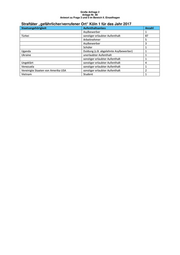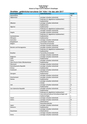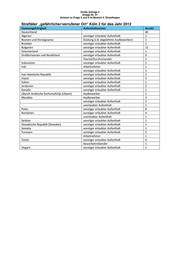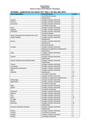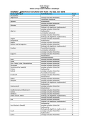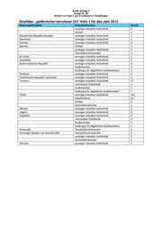 Große Anfrage 2 Anlage Nr. 88 Antwort zu Frage 3 und 5 im Bereich II. Einzelfragen Straftäter „gefährlicher/verrufener Ort“ Köln 1 für das Jahr 2015 Staatsangehörigkeit Aufenthaltsanlass Anzahl sonstiger erlaubter Aufenthalt 8 Schüler 1 Slowakische Republik Slowakei sonstiger erlaubter Aufenthalt 2 Slowenien sonstiger erlaubter Aufenthalt 1 Somalia sonstiger erlaubter Aufenthalt 4 Spanien Schüler 1 sonstiger erlaubter Aufenthalt 5 Tourist/Durchreisender 1 Sri Lanka sonstiger erlaubter Aufenthalt 1 Staatenlos sonstiger erlaubter Aufenthalt 3 Syrien Arabische Republik sonstiger erlaubter Aufenthalt 4 Asylbewerber 3 Duldung (z.B. abgelehnte Asylbewerber) 1 Thailand sonstiger erlaubter Aufenthalt 4 Tschechische Republik Tschechien sonstiger erlaubter Aufenthalt 3 Tunesien sonstiger erlaubter Aufenthalt 17 unerlaubter Aufenthalt 1 Asylbewerber 2 Duldung (z.B. abgelehnte Asylbewerber) 1 Türkei sonstiger erlaubter Aufenthalt 122 Arbeitnehmer 11 Schüler 2 Gewerbetreibender 1 Ukraine sonstiger erlaubter Aufenthalt 1 Ungarn sonstiger erlaubter Aufenthalt 3 Ungeklärt sonstiger erlaubter Aufenthalt 4 unerlaubter Aufenthalt 1 Asylbewerber 1 Duldung (z.B. abgelehnte Asylbewerber) 1 Venezuela Tourist/Durchreisender 3 Vereinigte Staaten von Amerika USA Tourist/Durchreisender 1 sonstiger erlaubter Aufenthalt 2 Gewerbetreibender 1 Vietnam sonstiger erlaubter Aufenthalt 1