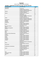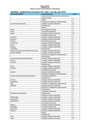 Große Anfrage 2 Anlage Nr. 89 Antwort zu Frage 3 und 5 im Bereich II. Einzelfragen Straftäter „gefährlicher/verrufener Ort“ Köln 1 für das Jahr 2016 Staatsangehörigkeit Aufenthaltsanlass Anzahl International/national Schutzberechtigte und Asylberechtigte 1 Schüler 1 Duldung (z.B. abgelehnte Asylbewerber) 1 Iran Islamische Republik sonstiger erlaubter Aufenthalt 31 Asylbewerber 4 Schüler 1 Irland Tourist/Durchreisender 1 Israel Tourist/Durchreisender 1 Italien sonstiger erlaubter Aufenthalt 29 Tourist/Durchreisender 1 Jordanien sonstiger erlaubter Aufenthalt 1 Kamerun sonstiger erlaubter Aufenthalt 1 Kanada Tourist/Durchreisender 1 Kasachstan sonstiger erlaubter Aufenthalt 8 Kenia sonstiger erlaubter Aufenthalt 1 Kirgistan sonstiger erlaubter Aufenthalt 1 Kolumbien Asylbewerber 1 Kongo, Demokratische Republik früher Zaire sonstiger erlaubter Aufenthalt 1 Kongo, Republik sonstiger erlaubter Aufenthalt 7 Duldung (z.B. abgelehnte Asylbewerber) 1 Asylbewerber 1 Korea Demokratische Volksrepublik sonstiger erlaubter Aufenthalt 1 Kosovo sonstiger erlaubter Aufenthalt 7 Kroatien sonstiger erlaubter Aufenthalt 7 Asylbewerber 1 Kuba sonstiger erlaubter Aufenthalt 1 Lettland sonstiger erlaubter Aufenthalt 12 Tourist/Durchreisender 2 Libanon sonstiger erlaubter Aufenthalt 1 Duldung (z.B. abgelehnte Asylbewerber) 1 Libysch Arabische Dschamahirija Libyen unerlaubter Aufenthalt 1 Asylbewerber 1 Litauen sonstiger erlaubter Aufenthalt 3 Luxemburg sonstiger erlaubter Aufenthalt 1 Mali Duldung (z.B. abgelehnte Asylbewerber) 1 Marokko sonstiger erlaubter Aufenthalt 29 Duldung (z.B. abgelehnte Asylbewerber) 5 Asylbewerber 10 unerlaubter Aufenthalt 1 Mazedonien Makedonien Asylbewerber 1 sonstiger erlaubter Aufenthalt 2 Montenegro sonstiger erlaubter Aufenthalt 1 Neuseeland sonstiger erlaubter Aufenthalt 1 Niederlande sonstiger erlaubter Aufenthalt 8 Tourist/Durchreisender 7 Nigeria sonstiger erlaubter Aufenthalt 1 Norwegen Tourist/Durchreisender 1 Österreich sonstiger erlaubter Aufenthalt 2 Pakistan sonstiger erlaubter Aufenthalt 2 Schüler 1 Asylbewerber 2 Peru sonstiger erlaubter Aufenthalt 2 Polen sonstiger erlaubter Aufenthalt 37
