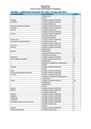 Große Anfrage 2 Anlage Nr. 89 Antwort zu Frage 3 und 5 im Bereich II. Einzelfragen Straftäter „gefährlicher/verrufener Ort“ Köln 1 für das Jahr 2016 Staatsangehörigkeit Aufenthaltsanlass Anzahl Arbeitnehmer 4 Schüler 1 Portugal sonstiger erlaubter Aufenthalt 2 Rumänien sonstiger erlaubter Aufenthalt 22 Kontingentflüchtlinge 1 Russische Föderation Russland sonstiger erlaubter Aufenthalt 5 Schweden sonstiger erlaubter Aufenthalt 1 Schweiz Tourist/Durchreisender 5 sonstiger erlaubter Aufenthalt 2 Serbien sonstiger erlaubter Aufenthalt 10 Tourist/Durchreisender 2 Kontingentflüchtlinge 1 Sierra Leone sonstiger erlaubter Aufenthalt 1 Slowakische Republik Slowakei Tourist/Durchreisender 1 sonstiger erlaubter Aufenthalt 1 Slowenien sonstiger erlaubter Aufenthalt 1 Somalia sonstiger erlaubter Aufenthalt 4 Asylbewerber 4 Spanien Arbeitnehmer 1 sonstiger erlaubter Aufenthalt 15 Tourist/Durchreisender 1 Staatenlos sonstiger erlaubter Aufenthalt 3 Syrien Arabische Republik sonstiger erlaubter Aufenthalt 12 Asylbewerber 16 Duldung (z.B. abgelehnte Asylbewerber) 3 Student 1 Thailand sonstiger erlaubter Aufenthalt 2 Schüler 1 Togo sonstiger erlaubter Aufenthalt 2 Tschechische Republik Tschechien sonstiger erlaubter Aufenthalt 3 Tunesien sonstiger erlaubter Aufenthalt 3 Duldung (z.B. abgelehnte Asylbewerber) 1 Asylbewerber 1 Türkei sonstiger erlaubter Aufenthalt 158 Asylbewerber 4 Arbeitnehmer 7 Schüler 2 Uganda sonstiger erlaubter Aufenthalt 1 Ukraine sonstiger erlaubter Aufenthalt 4 unerlaubter Aufenthalt 2 Ungarn sonstiger erlaubter Aufenthalt 2 Ungeklärt sonstiger erlaubter Aufenthalt 8 Usbekistan sonstiger erlaubter Aufenthalt 1 Venezuela sonstiger erlaubter Aufenthalt 1 Vereinigte Staaten von Amerika USA sonstiger erlaubter Aufenthalt 7 Tourist/Durchreisender 2 Student 2 Vietnam sonstiger erlaubter Aufenthalt 1 Weißrussland Belarus Tourist/Durchreisender 1