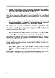 LANDTAG NORDRHEIN-WESTFALEN - 17. Wahlperiode Drucksache 17/15125 2. Wie viele Schülerinnen und Schüler beginnen zum Schuljahr 2021/2022 die praxis- integrierte Ausbildung zum/zur staatlich geprüften Erzieher/in in Nordrhein-West- falen? (Bitte tabellarisch nach Berufskollegs auflisten.) Die zur Beantwortung dieser Frage erforderlichen Informationen liegen der Landesregierung derzeit nicht vor. Ursächlich hierfür ist, dass die Amtlichen Schuldaten 2021/22 an den Schulen zum Stichtag 15. Oktober erhoben werden und voraussichtlich im Januar 2022 zur Verfügung stehen. 3. Wie viele der in Frage 3 genannten Auszubildenden nehmen an einer Umschulung teil, für die das Land die Förderung des dritten Ausbildungsjahres übernimmt? (Bitte möglichst ebenfalls tabellarisch nach Berufskollegs auflisten.) Wie viele der in Frage 2 genannten Auszubildenden an einer Umschulung teilnehmen, für die das Land eine Förderung im dritten Ausbildungsjahr beabsichtigt, kann gegenwärtig noch nicht beantwortet werden, da entsprechende Daten der Bundesagentur für Arbeit/ Regionaldirektion Nordrhein-Westfalen noch nicht vorliegen. 4. Wie viele der in den Fragen 1-3 genannten Personen waren zuvor über das Kita- Helfer-Programm als Alltagshelferinnen oder -helfer in Kitas eingestellt? Nach Auskunft des Deutschen Roten Kreuzes Kreisverband Euskirchen e.V. sind nach dorti- gem bisherigen Kenntnisstand alle unter Frage 1 genannten Personen bereits als Kita-Helfe- rinnen und Kita-Helfer beschäftigt gewesen. Da noch keine Daten zur Zahl der Teilnehmenden an der Umschulung zur Erzieherin bzw. zum Erzieher vorliegen, ist ein Abgleich mit einer vorangegangenen Tätigkeit als Kita-Helferin bzw. als Kita-Helfer nicht möglich. 5. Wie plant das Land auch in den kommenden Kita-Jahren Umschulungen zum/zur Erzieher/in und Qualifizierungsmaßnahmen für Assistenzkräfte finanziell zu för- dern? Eine Fortsetzung der Förderung der Qualifizierungsmaßnahmen sowie der Umschulung zur Erzieherin bzw. zum Erzieher wird angestrebt und zu gegebener Zeit entschieden. 2