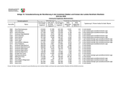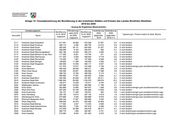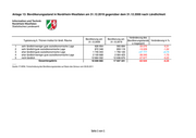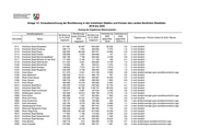 Anlage 14: Vorausberechnung der Bevölkerung in den kreisfreien Städten und Kreisen des Landes Nordrhein-Westfalen 2018 bis 2025 - Auszug der Ergebnisse (Basisvariante) - Verwaltungsbezirk Wanderungs- Veränderung Veränderung Bevölkerung Bevölkerung saldo 2018 bis 2025 2025 01.01.2018 01.01.2025 Typisierung lt. Thünen-Institut für ländl. Räume Kennziffer Name 2025 gegenüber gegenüber insgesamt insgesamt insgesamt 2018 2018 in % 5562 Kreis Recklinghausen 616 824 11 971 607 879 -8 945 -1,5 5 nicht ländlich 5566 Kreis Steinfurt 446 565 9 284 451 698 5 133 1,1 2 sehr ländlich/gute sozioökonomische Lage 5570 Kreis Warendorf 277 458 3 573 276 353 -1 105 -0,4 3 eher ländlich/gute sozioökonomische Lage 5711 Kreisfreie Stadt Bielefeld 332 552 6 201 337 344 4 792 1,4 5 nicht ländlich 5754 Kreis Gütersloh 363 049 7 713 368 031 4 982 1,4 3 eher ländlich/gute sozioökonomische Lage 5758 Kreis Herford 251 539 5 066 250 405 -1 134 -0,5 3 eher ländlich/gute sozioökonomische Lage 5762 Kreis Höxter 141 565 33 137 501 -4 064 -2,9 1 sehr ländlich/weniger gute sozioökonomische Lage 5766 Kreis Lippe 349 069 2 199 343 782 -5 287 -1,5 4 eher ländlich/weniger gute sozioökonomische Lage 5770 Kreis Minden-Lübbecke 311 207 3 444 308 090 -3 117 -1,0 4 eher ländlich/weniger gute sozioökonomische Lage 5774 Kreis Paderborn 305 362 4 450 311 182 5 820 1,9 3 eher ländlich/gute sozioökonomische Lage 5911 Kreisfreie Stadt Bochum 365 529 7 455 363 519 -2 010 -0,5 5 nicht ländlich 5913 Kreisfreie Stadt Dortmund 586 600 23 319 600 571 13 971 2,4 5 nicht ländlich 5914 Kreisfreie Stadt Hagen 187 730 3 179 185 932 -1 798 -1,0 5 nicht ländlich 5915 Kreisfreie Stadt Hamm 179 185 2 483 178 587 - 598 -0,3 5 nicht ländlich 5916 Kreisfreie Stadt Herne 156 490 4 704 155 630 - 860 -0,5 5 nicht ländlich 5954 Ennepe-Ruhr-Kreis 324 670 7 745 320 058 -4 612 -1,4 5 nicht ländlich 5958 Hochsauerlandkreis 261 591 - 986 253 609 -7 982 -3,1 1 sehr ländlich/weniger gute sozioökonomische Lage 5962 Märkischer Kreis 413 383 -7 744 394 923 -18 460 -4,5 5 nicht ländlich 5966 Kreis Olpe 134 808 - 202 132 643 -2 165 -1,6 2 sehr ländlich/gute sozioökonomische Lage 5970 Kreis Siegen-Wittgenstein 277 977 3 851 276 550 -1 427 -0,5 2 sehr ländlich/gute sozioökonomische Lage 5974 Kreis Soest 301 693 5 273 299 404 -2 289 -0,8 4 eher ländlich/weniger gute sozioökonomische Lage 5978 Kreis Unna 393 934 8 997 390 343 -3 591 -0,9 5 nicht ländlich Hinweis: Die Daten sind der Vorausberechnung der Bevölkerung in den kreisfreien Städten und Kreisen des Landes Nordrhein-Westfalen 2018 bis 2040/60 entnommen.