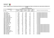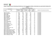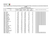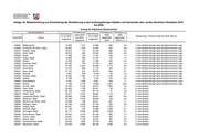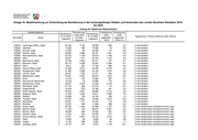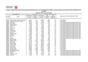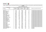 Anlage 18: Modellrechnung zur Entwicklung der Bevölkerung in den kreisangehörigen Städten und Gemeinden des Landes Nordrhein-Westfalen 2018 bis 2030 - Auszug der Ergebnisse (Basisvariante) - Verwaltungsbezirk Wanderungs- Veränderung Veränderung Bevölkerung Bevölkerung saldo 2018 2030 2030 01.01.2018 01.01.2030 Typisierung lt. Thünen-Institut für ländl. Räume Kennziffer Name bis 2030 gegenüber gegenüber insgesamt insgesamt insgesamt 2018 2018 in % 334032 Stolberg (Rhld.), Stadt (ab 21.10.2009) 56 751 4 171 58 655 1 904 3,4 5 nicht ländlich 334036 Würselen, Stadt (ab 21.10.2009) 38 934 4 401 41 760 2 826 7,3 5 nicht ländlich 358004 Aldenhoven 13 877 610 14 095 218 1,6 4 eher ländlich/weniger gute sozioökonomische Lage 358008 Düren, Stadt 90 502 4 580 91 972 1 470 1,6 4 eher ländlich/weniger gute sozioökonomische Lage 358012 Heimbach, Stadt 4 319 109 3 961 - 358 -8,3 4 eher ländlich/weniger gute sozioökonomische Lage 358016 Hürtgenwald 8 644 153 8 544 - 100 -1,2 4 eher ländlich/weniger gute sozioökonomische Lage 358020 Inden 7 426 1 116 8 455 1 029 13,9 4 eher ländlich/weniger gute sozioökonomische Lage 358024 Jülich, Stadt 32 505 1 944 32 966 461 1,4 4 eher ländlich/weniger gute sozioökonomische Lage 358028 Kreuzau 17 582 265 17 176 - 406 -2,3 4 eher ländlich/weniger gute sozioökonomische Lage 358032 Langerwehe 13 986 995 14 521 535 3,8 4 eher ländlich/weniger gute sozioökonomische Lage 358036 Linnich, Stadt 12 484 547 12 066 - 418 -3,3 4 eher ländlich/weniger gute sozioökonomische Lage 358040 Merzenich 9 733 - 26 9 210 - 523 -5,4 4 eher ländlich/weniger gute sozioökonomische Lage 358044 Nideggen, Stadt 9 855 267 9 031 - 824 -8,4 4 eher ländlich/weniger gute sozioökonomische Lage 358048 Niederzier 13 920 264 13 740 - 180 -1,3 4 eher ländlich/weniger gute sozioökonomische Lage 358052 Nörvenich 10 447 593 10 369 - 78 -0,7 4 eher ländlich/weniger gute sozioökonomische Lage 358056 Titz 8 329 801 8 575 246 3,0 4 eher ländlich/weniger gute sozioökonomische Lage 358060 Vettweiß 9 280 670 9 783 503 5,4 4 eher ländlich/weniger gute sozioökonomische Lage 362004 Bedburg, Stadt 23 531 635 22 701 - 830 -3,5 5 nicht ländlich 362008 Bergheim, Stadt 61 099 3 610 63 292 2 193 3,6 5 nicht ländlich 362012 Brühl, Stadt 44 144 2 482 44 247 103 0,2 5 nicht ländlich 362016 Elsdorf, Stadt 21 539 716 21 444 - 95 -0,4 5 nicht ländlich 362020 Erftstadt, Stadt 49 647 1 320 48 365 -1 282 -2,6 5 nicht ländlich 362024 Frechen, Stadt 52 212 6 160 56 190 3 978 7,6 5 nicht ländlich 362028 Hürth, Stadt 59 762 9 971 68 194 8 432 14,1 5 nicht ländlich 362032 Kerpen, Stadt 65 420 667 66 114 694 1,1 5 nicht ländlich 362036 Pulheim, Stadt 53 900 3 952 55 778 1 878 3,5 5 nicht ländlich 362040 Wesseling, Stadt 35 955 3 245 38 525 2 570 7,1 5 nicht ländlich 366004 Bad Münstereifel, Stadt 17 262 1 323 16 906 - 356 -2,1 1 sehr ländlich/weniger gute sozioökonomische Lage 366008 Blankenheim 8 397 641 8 176 - 221 -2,6 1 sehr ländlich/weniger gute sozioökonomische Lage 366012 Dahlem 4 202 366 4 155 - 47 -1,1 1 sehr ländlich/weniger gute sozioökonomische Lage 366016 Euskirchen, Stadt 57 715 1 745 58 175 460 0,8 1 sehr ländlich/weniger gute sozioökonomische Lage 366020 Hellenthal 7 929 72 7 313 - 616 -7,8 1 sehr ländlich/weniger gute sozioökonomische Lage