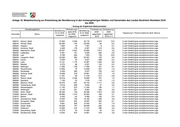 Anlage 18: Modellrechnung zur Entwicklung der Bevölkerung in den kreisangehörigen Städten und Gemeinden des Landes Nordrhein-Westfalen 2018 bis 2030 - Auszug der Ergebnisse (Basisvariante) - Verwaltungsbezirk Wanderungs- Veränderung Veränderung Bevölkerung Bevölkerung saldo 2018 2030 2030 01.01.2018 01.01.2030 Typisierung lt. Thünen-Institut für ländl. Räume Kennziffer Name bis 2030 gegenüber gegenüber insgesamt insgesamt insgesamt 2018 2018 in % 554036 Legden 7 295 96 7 479 184 2,5 3 eher ländlich/gute sozioökonomische Lage 554040 Raesfeld 11 350 323 11 665 315 2,8 3 eher ländlich/gute sozioökonomische Lage 554044 Reken 14 670 1 108 15 090 420 2,9 3 eher ländlich/gute sozioökonomische Lage 554048 Rhede, Stadt 19 165 - 390 18 274 - 891 -4,6 3 eher ländlich/gute sozioökonomische Lage 554052 Schöppingen 7 066 -1 398 5 369 -1 697 -24,0 3 eher ländlich/gute sozioökonomische Lage 554056 Stadtlohn, Stadt 20 367 229 20 735 368 1,8 3 eher ländlich/gute sozioökonomische Lage 554060 Südlohn 9 143 453 9 291 148 1,6 3 eher ländlich/gute sozioökonomische Lage 554064 Velen, Stadt 12 989 88 12 866 - 123 -0,9 3 eher ländlich/gute sozioökonomische Lage 554068 Vreden, Stadt 22 561 - 788 21 675 - 886 -3,9 3 eher ländlich/gute sozioökonomische Lage 558004 Ascheberg 15 283 497 15 617 334 2,2 3 eher ländlich/gute sozioökonomische Lage 558008 Billerbeck, Stadt 11 544 122 11 179 - 365 -3,2 3 eher ländlich/gute sozioökonomische Lage 558012 Coesfeld, Stadt 36 302 254 35 482 - 820 -2,3 3 eher ländlich/gute sozioökonomische Lage 558016 Dülmen, Stadt 46 507 1 002 45 276 -1 231 -2,6 3 eher ländlich/gute sozioökonomische Lage 558020 Havixbeck 11 732 561 11 763 31 0,3 3 eher ländlich/gute sozioökonomische Lage 558024 Lüdinghausen, Stadt 24 550 2 025 25 340 790 3,2 3 eher ländlich/gute sozioökonomische Lage 558028 Nordkirchen 9 941 569 10 171 230 2,3 3 eher ländlich/gute sozioökonomische Lage 558032 Nottuln 19 590 1 088 20 331 741 3,8 3 eher ländlich/gute sozioökonomische Lage 558036 Olfen, Stadt 12 674 1 524 13 564 890 7,0 3 eher ländlich/gute sozioökonomische Lage 558040 Rosendahl 10 716 424 10 904 188 1,8 3 eher ländlich/gute sozioökonomische Lage 558044 Senden 20 521 1 480 22 028 1 507 7,3 3 eher ländlich/gute sozioökonomische Lage 562004 Castrop-Rauxel, Stadt 73 989 3 975 71 968 -2 021 -2,7 5 nicht ländlich 562008 Datteln, Stadt 34 563 408 32 832 -1 731 -5,0 5 nicht ländlich 562012 Dorsten, Stadt 75 252 1 379 72 529 -2 723 -3,6 5 nicht ländlich 562014 Gladbeck, Stadt 75 689 6 049 77 334 1 645 2,2 5 nicht ländlich 562016 Haltern am See, Stadt 37 977 1 075 37 633 - 344 -0,9 5 nicht ländlich 562020 Herten, Stadt 61 669 3 368 60 904 - 765 -1,2 5 nicht ländlich 562024 Marl, Stadt 83 695 2 374 81 045 -2 650 -3,2 5 nicht ländlich 562028 Oer-Erkenschwick, Stadt 31 378 285 30 152 -1 226 -3,9 5 nicht ländlich 562032 Recklinghausen, Stadt 113 360 666 107 668 -5 692 -5,0 5 nicht ländlich 562036 Waltrop, Stadt 29 252 1 791 29 213 - 39 -0,1 5 nicht ländlich 566004 Altenberge 10 282 1 210 11 549 1 267 12,3 2 sehr ländlich/gute sozioökonomische Lage 566008 Emsdetten, Stadt 36 151 921 36 170 19 0,1 2 sehr ländlich/gute sozioökonomische Lage