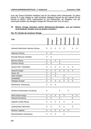 LANDTAG NORDRHEIN-WESTFALEN - 17. Wahlperiode Drucksache 17/8469 Auch das Thema Künstliche Intelligenz wird für die Verlage immer interessanter. So geben bereits 74 % aller Verlage an, dass künstliche Intelligenz relevant bis sehr relevant für die Zukunft ist (BDZV, 2019). Insbesondere für den Werbemarkt, die Redaktion und den Lesermarkt schätzen die befragten Verlage das Potenzial sehr hoch ein (ebd.). 78. Welche Verlage betreiben welche Multichannel-Strategien, und auf welchen verschiedenen Kanälen sind sie jeweils vertreten? Tab. 78.1 Kanäle der einzelnen Verlage facebook Instagram YouTube WhatsApp Podcasts Newsletter Pinterest Titel Twitter Aachener Nachrichten/ Aachener Zeitung X X X X X X X Allgemeine Zeitung X X Bocholter-Borkener Volksblatt X X Borkener Zeitung X X X X Dülmener Zeitung X X X Express (Köln / Düsseldorf) X X X X X X X General-Anzeiger X X X X X X X Glocke, Die X X X Haller Kreisblatt X X X X Handelsblatt X X X X X Hellweger Anzeiger X X X X X X X Ibbenbürener Volkszeitung X X X Iserlohner Kreisanzeiger und Zeitung X X X Kölner Stadt-Anzeiger X X X X X X X Kölnische Rundschau X X X X Lippische Landes-Zeitung X X X X X X Lüdenscheider Nachrichten X X X X X Mindener Tageblatt X X X X X X Münsterländische Volkszeitung X X X X 304