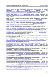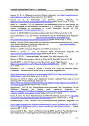 LANDTAG NORDRHEIN-WESTFALEN - 17. Wahlperiode Drucksache 17/8469 bdzv.de (o. D. c). Mitgliederverzeichnis [Online]. Abgerufen von https://www.bdzv.de/der- bdzv/mitgliederverzeichnis/ [letzter Aufruf am 25.11.2019] bdzv.de (o. D. d). Tarifverträge zum Download [Online]. Abgerufen von https://www.bdzv.de/recht-sozialpolitik/tarif/tarifvertraege/ [letzter Aufruf am 25.11.2019] Beiler, M., & Gerstner, J. (2019). Newsroom- und Newsdeskstrukturen zur Reduzierung von Binnenkomplexität im crossmedialen Journalismus. In B. Dernbach., A. Godulla, A. Sehl (Hrsg.), Komplexität im Journalismus (S. 91-99). Wiesbaden: Springer VS. DOI: https://doi.org/10.1007/978-3-658-22860-6_9 Bender, S. (2017). WDR: Crossmedia als Sparmodell. DJV NRW Journal, (2), 18-19. berufundfamilie.de (o. D.). Die Kriterien: Qualitätssicherung des Zertifikats [Online]. Abgerufen von https://www.berufundfamilie.de/zertifikat-audit- berufundfamilie/auszeichnung/zertifizierungskriterien [letzter Aufruf am 25.11.2019] Best for Planning (2019). Reichweiten von regionalen Tageszeitungen bundesweit in Prozent nach Staatsangehörigkeit [Datenset]. Abgerufen von https://gik.media/b4p- shop/ [letzter Aufruf am 25.11.2019] Blümel, C. (2017a). Crossis in Wuppertal. DJV NRW Journal, (2), 19. Blümel, C. (2017b, 14. Juni). Der Anspruch bleibt. journal-nrw.de. Abgerufen von https://journal-nrw.de/der-anspruch-bleibt/ [letzter Aufruf am 25.11.2019] Blümel, C. (2017c). „Zusammenrücken“ bei DuMont. DJV NRW Journal, (1), 24. Blümel, C. (2019). Gemeinsame Holding für WN und WB. DJV NRW Journal, (1), 24. Boll, M. (2019, 1. Juli). „Wir freuen uns auf Burscheid“. rga.de. Abgerufen von https://www.rga.de/ueber-uns/wir-freuen-burscheid-12752351.html [letzter Aufruf am 25.11.2019] Borchardt, A., Lück, J., Kieslich, S., Schultz, T., & Simon, F. M. (2019). Are Journalists Today’s Coal Miners?. Reuters Institute for the Study of Journalism. Abgerufen von https://reutersinstitute.politics.ox.ac.uk/sites/default/files/2019-07/Talent-and-Diversity-in-the- Media-Report_0.pdf [letzter Aufruf am 25.11.2019] Borchers, D. (2019, 5. März). „Kein signifikanter Anstieg“: Adblocker-Rate steigt um 0,24 Prozentpunkte [Pressemitteilung]. Abgerufen von https://www.bvdw.org/presse/detail/artikel/kein-signifikanter-anstieg-adblocker-rate-steigt-um- 024-prozentpunkte/ [letzter Aufruf am 25.11.2019] Borgböhmer, T. (2019, 8. Juli). “Nachholbedarf beim Preismodell”: Wie Chefredakteur Piel das “Mindener Tageblatt” fürs Digitale rüstet. meedia.de. Abgerufen von https://meedia.de/2019/07/08/nachholbedarf-beim-preismodell-wie-chefredakteur-piel-das- mindener-tageblatt-fuers-digitale-ruestet/ [letzter Aufruf am 25.11.2019] Bruns, R. (2013, 12. März). High-Potantials als Hilfskräfte [Online]. Abgerufen von https://die- pressestelle.de/2013/03/high-potantials-als-hilfskraefte/ [letzter Aufruf am 25.11.2019] Bundesanzeiger (2019). Umsätze und Konzernüberschüsse [Datenset]. Abgerufen von https://www.bundesanzeiger.de/ebanzwww/wexsservlet?session.sessionid=a6d16b1e54509 bc3df7a25f4b47c9a3f&page.navid=to_search_start&global_data.designmode=eb [letzter Aufruf am 25.11.2019] Bundesinstitut für Bau-, Stadt- und Raumforschung (2009). Laufende Raumbeobachtung – Raumabgrenzungen. Siedlungsstrukturelle Regionstypen [Datenset]. Abgerufen von 311