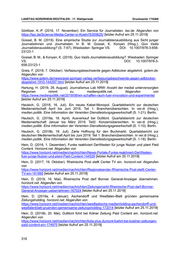 LANDTAG NORDRHEIN-WESTFALEN - 17. Wahlperiode Drucksache 17/8469 Görlitzer, K.-P. (2016, 17. November). Ein Service für Journalisten. taz.de. Abgerufen von https://taz.de/Science-Media-Center-in-Koeln/!5355625/ [letzter Aufruf am 25.11.2019] Gossel, B. M. (2019). Eine empirische Studie zur Journalistenausbildung aus Sicht junger Journalistinnen und Journalisten. In B. M. Gossel, K. Konyen (Hrsg.), Quo Vadis Journalistenausbildung? (S. 7-67). Wiesbaden: Springer VS. DOI: 10.1007/978-3-658- 23123-1 Gossel, B. M., & Konyen, K. (2019). Quo Vadis Journalistenausbildung?. Wiesbaden: Springer VS. DOI: 10.1007/978-3- 658-23123-1 Greis, F. (2019, 7. Oktober). Verfassungsbeschwerde gegen Adblocker abgelehnt. golem.de. Abgerufen von https://www.golem.de/news/axel-springer-verlag-verfassungsbeschwerde-gegen-adblocker- abgelehnt-1910-144297.html [letzter Aufruf am 25.11.2019] Hartung, H. (2019, 26. August). Journalismus Lab NRW: Anzahl der medial unterversorgten Regionen nimmt zu. medienpolitik.net. Abgerufen von https://www.medienpolitik.net/2019/08/wir-schaffen-raum-fuer-innovation-und-experimente/ [letzter Aufruf am 25.11.2019] Hautsch, G. (2018, 16. Juli). Ein neues Kabel-Monopol. Quartalsbericht zur deutschen Medienwirtschaft April bis Juni 2018. Teil 1: Branchenübersichten. In ver.di (Hrsg.), medien.politik. Eine Information der Vereinten Dienstleistungsgewerkschaft (S. 1-21). Berlin. Hautsch, G. (2019a, 18. April). Ausverkauf bei DuMont. Quartalsbericht zur deutschen Medienwirtschaft Januar bis März 2019. Teil2: Konzernübersichten. In ver.di (Hrsg.), medien.politik. Eine Information der Vereinten Dienstleistungsgewerkschaft (S. 1-10). Berlin. Hautsch, G. (2019b, 19. Juli). Zarte Hoffnung für den Buchmarkt. Quartalsbericht zur deutschen Medienwirtschaft April bis Juni 2019. Teil 1: Branchenübersichten. In ver.di (Hrsg.), medien.politik. Eine Information der Vereinten Dienstleistungsgewerkschaft (S. 1-18). Berlin. Hein, D. (2016, 1. Dezember). Funke reaktiviert DerWesten für junge Nutzer und plant Paid Content. Horizont.net. Abgerufen von https://www.horizont.net/medien/nachrichten/News-Portale-Funke-reaktiviert-DerWesten- fuer-junge-Nutzer-und-plant-Paid-Content-144529 [letzter Aufruf am 25.11.2019] Hein, D. (2017, 19. Oktober). Rheinische Post stellt Center TV ein. horizont.net. Abgerufen von https://www.horizont.net/medien/nachrichten/Regionalsender-Rheinische-Post-stellt-Center- TV-ein-161995 [letzter Aufruf am 25.11.2019] Hein, D. (2018, 16. Mai). Rheinische Post darf Bonner General-Anzeiger übernehmen. horizont.net. Abgerufen von https://www.horizont.net/medien/nachrichten/Zeitungsmarkt-Rheinische-Post-darf-Bonner- General-Anzeiger-uebernehmen-167024 [letzter Aufruf am 25.11.2019] Hein, D. (2019a, 4. Januar). Aschendorff und Westfalen-Blatt gründen gemeinsame Zeitungsholding. horizont.net. Abgerufen von https://www.horizont.net/medien/nachrichten/westfaelische-medienholding-aschendorff-und- westfalenblatt-gruenden-gemeinsame-zeitungsholding-172014 [letzter Aufruf am 25.11.2019] Hein, D. (2019b, 20. Mai). DuMont führt bei Kölner Zeitung Paid Content ein. horizont.net. Abgerufen von https://www.horizont.net/medien/nachrichten/ksta-plus-dumont-fuehrt-bei-koelner-zeitungen- paid-content-ein-174975 [letzter Aufruf am 25.11.2019] 316