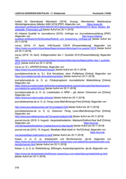 LANDTAG NORDRHEIN-WESTFALEN - 17. Wahlperiode Drucksache 17/8469 Institut für Demoskopie Allensbach (2019). Auszug. Allensbacher Marktanalyse Werbeträgeranalyse (Medien AWA 2019) [PDF]. Abgerufen von https://www.ifd- allensbach.de/fileadmin/AWA/AWA2019/Codebuchausschnitte/AWA2019_Band_Medien_Ba sistabelle_Printmedien.pdf [letzter Aufruf am 25.11.2019] IQ Initiative Qualität im Journalismus (2016). Umfrage zur Journalistenausbildung [PDF]. Abgerufen von http://www.initiative- qualitaet.de/fileadmin/IQ/Aktuelles/Referat_und_Auswertung_Umfrage.pdf [letzter Aufruf am 25.11.2019] ivw.eu (2016, 21. April). IVW-Quartal 1/2016 [Pressemitteilung]. Abgerufen von https://www.ivw.eu/print/quartalsauflagen/pressemitteilungen/ivw-quartal-12016 [letzter Aufruf am 25.11.2019] ivw.eu (2019, 18. April). Auflagenzahlen des 1. Quartals 2019 [Pressemitteilung]. Abgerufen von https://www.ivw.eu/print/quartalsauflagen/pressemitteilungen/auflagenzahlen-des-1-quartals- 2019 [letzter Aufruf am 25.11.2019] ivw.eu (o. D.). ePAPER [Online]. Abgerufen von https://www.ivw.eu/print/epaper/epaper [letzter Aufruf am 25.11.2019] jounalistenschule.de (o. D.). Erst Kernphase, dann Profilphase [Online]. Abgerufen von https://journalistenschule.de/ausbildung/zeiten/ [letzter Aufruf am 25.11.2019] journalismuslab.de (o. D. a). Förderprogramm Journalistische Weiterbildung [Online]. Abgerufen von https://www.journalismuslab.de/foerderung/abgelaufene-ausschreibungen/foerderprogramm- journalistische-weiterbildung/ [letzter Aufruf am 25.11.2019] journalismuslab.de (o. D. b). Lokalmedien in NRW – gib deinen Ortsnamen ein [Online]. Abgerufen von https://www.journalismuslab.de/karte/ [letzter Aufruf am 25.11.2019] journalistenpreise.de (o. D. a). Ferag Leser-Blatt-Bindungs-Preis [Online]. Abgerufen von http://www.journalistenpreise.de/?id=preis&pid=246 [letzter Aufruf am 25.11.2019] journalistenpreise.de (o. D. b). Gewinner: Ferag Leser-Blatt-Bindungs-Preis [Online]. Abgerufen von http://www.journalistenpreise.de/?id=gewinner&pid=246 [letzter Aufruf am 25.11.2019] journal-nrw.de (2018, 9. August). Hauptstadtredaktion: Madsack/DuMont-Deal läuft [Online]. Abgerufen von https://journal- nrw.de/hauptstadtredaktion-madsackdumont-deal-laeuft/ [letzter Aufruf am 25.11.2019] journal-nrw.de (2019, 15. August). Westfalen-Blatt bleibt im Tarif [Online]. Abgerufen von https://journal- nrw.de/westfalen-blatt-bleibt-im-tarif/ [letzter Aufruf am 25.11.2019] Kaiser, U. (o. D. a). Arbeitsmarkt und Berufschancen. djv.de. Abgerufen von https://www.djv.de/en/startseite/info/themen-wissen/aus-und-weiterbildung/arbeitsmarkt-und- berufschancen.html [letzter Aufruf am 25.11.2019] Kaiser, U. (o. D. b). Weiterbildung, Stiftungen, Auslandsprogramme. djv.de. Abgerufen von https://www.djv.de/startseite/info/themen-wissen/aus-und-weiterbildung/weiterbildung.html [letzter Aufruf am 25.11.2019] 318