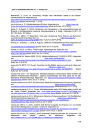 LANDTAG NORDRHEIN-WESTFALEN - 17. Wahlperiode Drucksache 17/8469 Kallenbach, A. (2016, 14. November). Projekt "Hier ankommen" startet in 88 Klassen. ruhrnachrichten.de. Abgerufen von https://www.ruhrnachrichten.de/dortmund/projekt-hier-ankommen-startet-in-88-klassen- 81822.html [letzter Aufruf am 25.11.2019] kek-online.de (o. D.). Mediendatenbank [Online]. Abgerufen von https://www.kek- online.de/medienkonzentration/mediendatenbank [letzter Aufruf am 25.11.2019] Keller, D., & Eggert, C. (2018). Tendenzen und Perspektiven – Die wirtschaftliche Lage der Branche. In Bundesverband Deutscher Zeitungsverleger e. V. (Hrsg.), Zeitungen 2018/19 (S. 41-118). Berlin: ZV Edition. Klose, M.-L. (2014, 17. Dezember). Trotz guter Ausbildung: Keine Chance auf Zukunft im Journalismus [Online]. Abgerufen von https://userpage.fu- berlin.de/melab/wordpress/?p=2465 [letzter Aufruf am 25.11.2019] Krämer, B., & Blümel, C. (2018, 9. August). Tarifflucht in Ostwestfalen [Online]. Abgerufen von https://journal- nrw.de/tarifflucht-in-ostwestfalen/ [letzter Aufruf am 25.11.2019] Krause, S. (2018, 12. März). Prekäre Lage. tagesspiegel.de. Abgerufen von https://www.tagesspiegel.de/gesellschaft/medien/studie-zu-freien-journalisten-prekaere- lage/21057764.html [letzter Aufruf am 25.11.2019] Landesanstalt für Medien NRW (2019). Medienvielfaltsbericht 2018/2019 [PDF]. Abgerufen von https://www.medienanstalt- nrw.de/service/berichte/medienkonzentrationsbericht-medienvielfaltsbericht.html [letzter Aufruf am 5.12.2019] Lessenich, N. (2019, 11. Februar). Neue App mit alter Stärke. aachener-zeitung.de. Abgerufen von https://www.aachener- zeitung.de/digital/neue-news-app-mit-neuem-design-bei-az-und-an_aid-36549741 [letzter Aufruf am 25.11.2019] madsack.de (2017, 29. September). RedaktionsNetzwerk Deutschland (RND) beliefert ab Oktober Redaktionsnetz Westfalen – tägliche Gesamtauflage des RND steigt auf 1,5 Mio. Exemplare [Pressemitteilung]. Abgerufen von https://www.madsack.de/Presse/2017/RND- beliefert-RNW [letzter Aufruf am 25.11.2019] medienanstalt-nrw.de (2017, 30. November). Medienkonzentrationsbericht [online]. Abgerufen von https://www.medienanstalt- nrw.de/service/berichte/medienkonzentrationsbericht.html [letzter Aufruf am 25.11.2019] medienmoral-nrw.de (o. D. a). Funke: NRW-Betriebsräte sehen 300 Stellen allein in NRW auf der Kippe [Online]. Abgerufen von https://www.medienmoral-nrw.de/2019/02/funke-nrw- betriebsraete-sehen-300-stellen-allein-in-nrw-auf-der-kippe/ [letzter Aufruf am 25.11.2019] medienmoral-nrw.de (o. D. b). Münstersche Zeitung will „Sanierungsfusion“ mit Westfälischen Nachrichten [Online]. Abgerufen von https://www.medienmoral- nrw.de/2014/08/munstersche-zeitung-will-sanierungsfusion-mit-westfalischen- nachrichten/#more-1964 [letzter Aufruf am 25.11.2019] meedia.de (2017a, 5. April). DuMont stellt Bonner Ausgabe des Express ein und startet wöchentliche Beilage Bonn kompakt. meedia.de. Abgerufen von https://meedia.de/2017/04/05/dumont-stellt-bonner-ausgabe-des-express-ein-und-startet- woechentliche-beilage-bonn-kompakt/ [letzter Aufruf am 25.11.2019] meedia.de (2017b, 19. Oktober). „Stark verändertes Nutzungsverhalten der Zuschauer“: Die Rheinische Post stampft center.tv ein. meedia.de. Abgerufen von https://meedia.de/2017/10/19/stark-ver%c2%adaen%c2%adderndes- 319