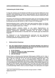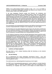 LANDTAG NORDRHEIN-WESTFALEN - 17. Wahlperiode Drucksache 17/9883 ausgewählten Daten abgebildet. Daher kann keine Aussage zu „Erlaubniserteilungen pro Kalenderjahr“ getroffen werden. Es können jedoch die im NWR gespeicherten Erlaubnisse zu einem Stichtag mitgeteilt werden. Die folgende Tabelle führt die Gesamtzahl aller gespeicherten zum jeweiligen Stichtag gültigen Erlaubnisse im Zuständigkeitsbereich des Landes Nordrhein-Westfalen (inkl. Kleiner Waffenscheine, Schießerlaubnisse etc.) zum 31.12. des jeweiligen Jahres auf: Jahr Erlaubnisse 2014 445.833 2015 436.193 2016 480.803 2017 496.309 2018 501.796 2019 507.415 Allenfalls durch eine rein händische Abfrage aller aktuellen und historischen Datensätze könnte das Jahr der Erteilung aller je in den Jahren 2014 bis 2019 erfassten Waffen ermittelt werden. Dies ist in Ansehung der Menge an abzufragenden Datensätzen nicht zumutbar. Es müssten die aktuell vorhandenen 507.415 Datensätze händisch gesichtet und das Jahr der Erteilung erfasst werden. Auf die dahingehenden Ausführungen unter I.1.a., ist hinsichtlich Umfang und Arbeitsweise zu verweisen. Auch bei unterstellter Annahme, dass mit dem dort angegebenen Arbeitsaufwand das Jahr der Erteilung mitermittelt werden könnte, stellt sich der Bearbeitungsaufwand als nicht zumutbar dar. In die vorzunehmende Abwägung ist weiter eingeflossen, dass Angaben zum Waffenbestand jeweils zum 31.12. eines Jahres möglich sind. 2. Wie viele und welche waffenrechtliche Erlaubnisse wurden in den Jahren 2014 bis 2019 entzogen? Bitte schlüsseln Sie auf nach: a. Grund des Entzugs b. Art der Erlaubnis c. Kalenderjahr d. Landkreis und Regierungsbezirk a. Grund des Entzugs Eine rückwirkende Auswertung des Nationalen Waffenregisters unter Angabe der Kreispolizeibehörden ist nur für die vergangenen vier Jahre möglich. Dies ist insoweit von Belang, als dass nur durch eine elektronische Auswertung die Sachverhalte ermittelt werden können, in denen es zu einem Entzug nach § 45 Abs. 1 oder Abs. 2 WaffG gekommen ist. Die Informationen für die Beantwortung der Frage bezüglich der Jahre 2014 und 2015 können nicht mit zumutbarem Aufwand in Erfahrung gebracht werden. Es müsste eine händische Auswertung der Jahre 2014 und 2015 erfolgen. Es müsste ein manueller Datenabgleich vorgenommen werden. Dieser manuelle Datenabgleich müsste vorliegend in der Form erfolgen, dass alle aktuell noch im NWR gespeicherten Datensätze durch hierfür abzustellendes Personal gesichtet und überprüft werden müssten, in wie weit es zu einem Erlaubnisentzug in den Jahren 2014 und 2015 gekommen ist. Insgesamt wären, ausgehend von einem aktuellen Datenbestand von den 8