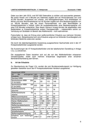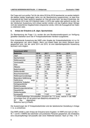 LANDTAG NORDRHEIN-WESTFALEN - 17. Wahlperiode Drucksache 17/9883 Daten aus dem Jahr 2019, rund 507.000 Datensätze zu sichten und auszuwerten gewesen. Bei einem Ansatz von 5 Minuten pro Datensatz ergäbe sich ein Personaleinsatz von rund 42.250 Stunden. Ausgehend von urlaubs- und feiertagsbereinigten 18,6 Arbeitstagen im Monat und einer Wochenarbeitszeit von 40 Stunden ergäbe sich eine Bearbeitungsdauer von ca. 283,94 Monaten, was bei einem Personaleinsatz von zwei Beschäftigten je Kreispolizeibehörde in Vollzeit, mithin 94 Landesbedienstete, einer Bearbeitungsdauer von etwa 3,02 Monaten entspräche. Über diesen Zeitraum hinweg könnten die abgestellten zwei Bediensteten je Kreispolizeibehörde andere Dienstgeschäfte – insbesondere solche zur Verhütung von Straftaten im Bereich des Waffenrechts – nicht wahrnehmen. Festzuhalten ist, dass ein Entzug einer waffenrechtlichen Erlaubnis aus mehreren Gründen erfolgen kann. Beispielsweise kann eine Erlaubnis aufgrund von fehlender Zuverlässigkeit und fehlendem Bedürfnis widerrufen werden. Die durch die datenbankgestützte Auswertung ausgeworfenen Sachverhalte sind in den 47 Kreispolizeibehörden ausgewertet worden. Die Auswertungen der 47 Kreispolizeibehörden sind der tabellarischen Darstellung in Anlage I.2.a. zu entnehmen. Die angegebenen Daten beziehen sich auf die von den Waffenbehörden erlassenen Verwaltungsakte, wobei auch mehrere Erlaubnisse Gegenstand einer einzelnen Behördenentscheidung sein können. b. Art der Erlaubnis Zur Beantwortung der Frage I.2.b. wurden die vom Bundesverwaltungsamt zur Verfügung gestellten Statistiken durch die 47 Kreispolizeibehörden händisch ausgewertet. Gesamtzahl NRW Art der entzogenen Jahr Jahr Jahr Jahr Erlaubnis 2016 2017 2018 2019 Standard-WBK 6331 7483 8304 9134 Sportschützen-WBK (bis 64 93 115 149 31.03.2003) Sportschützen-WBK (ab 323 369 420 458 01.04.2003) Waffenbesitzkarte für 41 63 72 78 Sammler Waffenbesitzkarte für 10 11 12 14 Vereine Mitbenutzererlaubnis 19 37 47 52 Munitionserwerbsschein 51 60 68 74 Kleiner Waffenschein 838 1109 1377 1777 Waffenschein 216 219 224 227 Waffenhandelserlaubnis unter 3 7 8 7 gewerbliche unter 3 unter 3 unter 3 unter 3 Waffenherstellungserlaubnis Schießerlaubnis 4 5 8 10 Waffentrageberechtigung 15 20 23 32 Erlaubnis zum Verbringen unter 3 0 unter 3 unter 3 Einfuhr 9