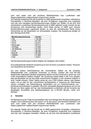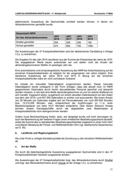 LANDTAG NORDRHEIN-WESTFALEN - 17. Wahlperiode Drucksache 17/9883 779 (eine Auswertung in Jahre ist technisch nicht Rhein-Kreis Neuss möglich) Rhein-Sieg-Kreis 77 15 34 71 34 43 Siegen-Wittgenstein 39 53 82 77 98 67 Soest 76 76 93 120 96 120 Steinfurt 41 88 69 92 80 102 Unna k. A. 121 82 79 104 98 Viersen 89 36 69 83 80 71 Warendorf 52 67 103 105 83 102 Wesel 143 155 194 183 117 159 Für den Bereich der Ordnungswidrigkeiten ist eine weitere Aufschlüsselung und Auswertung nicht mit einem zumutbaren Arbeits-, Personal- und Zeitaufwand durchzuführen. Da neben den angegebenen Daten kein elektronisches Datenmaterial vorgehalten wird, wäre zur weitergehenden Beantwortung der Frage eine händische Auswertung der einzelnen waffenrechtlichen Akten in den Kreispolizeibehörden erforderlich. Es müsste ein manueller Datenabgleich vorgenommen werden. Dieser manuelle Datenabgleich würde vorliegend in der Form erfolgen, dass alle betroffenen waffenrechtlichen Akten durch hierfür abzustellendes Personal gesichtet und überprüft werden müssten. Bei insgesamt 33.382 einschlägigen Ordnungswidrigkeiten-Verstößen und einem Ansatz von 30 Minuten pro Datensatz ergäbe sich ein Personaleinsatz von rund 1.001.460 Minuten bzw. 16.691 Stunden, was, entsprechend der Ausführungen zu I.1.a., einer Bearbeitungsdauer von etwa 1,19 Monaten entspräche. Über diesen Zeitraum hinweg könnten andere Dienstgeschäfte durch die abgestellten zwei Bediensteten je Kreispolizeibehörde nicht wahrgenommen werden. Zudem muss Berücksichtigung finden, dass, wie dargelegt wurde und noch darzulegen ist, auch die Beantwortung der weiteren Fragen einen erheblichen Bearbeitungsaufwand darstellt, wobei die Summe des zu betreibenden Bearbeitungsaufwandes insgesamt zu einer nicht mehr zumutbaren Belastung der Polizei- und Waffenbehörden führt (vgl. tabellarische Gesamtschau auf S. 55). Straftaten a. Art der Waffe Die Angaben zu der Art der verwendeten Waffe können nicht getätigt werden. Eine weitere Aufschlüsselung und Auswertung ist nicht mit einem zumutbaren Arbeits-, Personal- und Zeitaufwand durchzuführen. Da kein entsprechendes elektronisches Datenmaterial vorgehalten wird, wäre zur weitergehenden Beantwortung der Frage eine händische Auswertung der einzelnen Verfahrensakten in den einzelnen Kreispolizeibehörden vorzunehmen. Diese Erfassung würde in der Form erfolgen, dass alle betroffenen Verfahrensakten durch hierfür abzustellendes Personal gesichtet und überprüft werden müssten. Bei 34.071 Verstößen (PKS) und einem Ansatz von 30 Minuten pro Datensatz ergäbe sich ein Personaleinsatz von rund 1.022.130 Minuten bzw. 17.036 Stunden, was, entsprechend der Ausführungen zu I.1.a. einer Bearbeitungsdauer von etwa 1,22 Monaten entspräche. Über diesen Zeitraum hinweg könnten andere Dienstgeschäfte durch die abgestellten zwei Bediensteten je Kreispolizeibehörde nicht wahrgenommen werden. 19