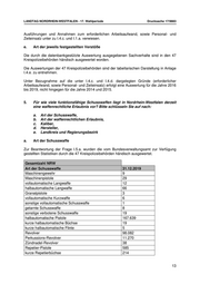 LANDTAG NORDRHEIN-WESTFALEN - 17. Wahlperiode Drucksache 17/9883 Bezüglich der Auswertungen für die Jahre 2014 bis 2015 wird auf die Anlage I.3.a. verwiesen. 4. In welchem Umfang werden die gesetzlich vorgesehenen Kontrollen der Aufbewahrung erlaubnispflichtiger Feuerwaffen und Munition im Land Nordrhein- Westfalen in den Jahren 2014 - 2019 durchgeführt? Bitte schlüsseln Sie auf nach: a. Kalenderjahr, b. Landkreis und Regierungsbezirk, c. Zahl der durchgeführten Kontrollen, d. Zahl der bei Kontrollen festgestellten Verstöße, e. Art der jeweils festgestellten Verstöße a. Kalenderjahr Das jeweilige Kalenderjahr ergibt sich aus den nachfolgenden Übersichten zu Punkt c. bis d. b. Landkreis und Regierungsbezirk Die nachfolgend unter Punkt c. bis d. erfolgte Darstellung bildet die Zuordnung zu den einzelnen Waffenbehörden ab. c. Zahl der durchgeführten Kontrollen Zur Beantwortung der Frage I.4.c. wurden die vom Bundesverwaltungsamt zur Verfügung gestellten Statistiken durch die 47 Kreispolizeibehörden händisch ausgewertet. Die Auswertungen der 47 Kreispolizeibehörden sind der tabellarischen Darstellung in Anlage I.4.c. zu entnehmen. Eine computergestützte Auswertung des NWR bei Aufschlüsselung auf die einzelnen Kreispolizeibehörden ist lediglich für die vergangenen vier Jahre möglich. Eine händische Auswertung der Jahre 2014 und 2015 in Bezug auf die einzelnen Kreispolizeibehörden ist unzumutbar. Im Hinblick auf die Zumutbarkeit wird auf die obigen Ausführungen verwiesen. Die Daten für die Jahre 2014 und 2015 müssten bei einer händischen Auswertung in der Form gewonnen werden, dass sämtliche waffenrechtliche Akten gesichtet werden, ob und mit welchem Ergebnis Vorortkontrollen durchgeführt wurden. Auf die insoweit ebenfalls zutreffenden Ausführungen und Annahmen zum erforderlichen Arbeitsaufwand, sowie Personal- und Zeiteinsatz unter I.1.a. wird verwiesen. d. Zahl der bei Kontrollen festgestellten Verstöße Zur Beantwortung der Frage I.4.d. wurden die vom Bundesverwaltungsamt zur Verfügung gestellten Statistiken durch die 47 Kreispolizeibehörden händisch ausgewertet. Die Auswertungen der 47 Kreispolizeibehörden sind der tabellarischen Darstellung in Anlage I.4.d. zu entnehmen. Eine computergestützte Auswertung des NWR bei Aufschlüsselung auf die einzelnen Kreispolizeibehörden ist lediglich für die vergangenen vier Jahre möglich. Eine händische Auswertung der Jahre 2014 und 2015 in Bezug auf die einzelnen Kreispolizeibehörden ist unzumutbar. Im Hinblick auf die Zumutbarkeit wird auf die insoweit ebenfalls zutreffenden 12