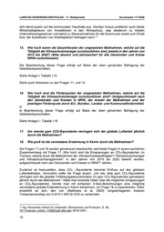 LANDTAG NORDRHEIN-WESTFALEN - 17. Wahlperiode Drucksache 17/13566 6. Wie hoch war der Anteil öffentlicher Fördermittel an den jährlichen Gesamtausgaben für weitere, dem Tätigkeitsbereich „Klimaschutz“ zugeordnete Mitarbeiter, in den Jahren von 2015 bis 2020, aufgeschlüsselt nach allen Gemeinden und Kreisen in NRW? (Bitte absolute Zahlen, aufgeschlüsselt nach den Fördergeldern, angeben und nach EU-, Bundes- und Landesfördermitteln aufschlüsseln) Die Beantwortung dieser Frage erfolgt auf Basis der oben genannten Befragung der Gebietskörperschaften. Siehe Anlage I: Tabelle I.6 Siehe auch Antwort auf Frage 4. 7. Wie hoch war der Anteil öffentlicher Fördermittel an den jährlichen Gesamtausgaben für Sachkosten, die dem "Klimaschutzbereich" zuzuordnen waren/sind, in den Jahren von 2015 bis 2020, aufgeschlüsselt nach allen Gemeinden und Kreisen in NRW? (Bitte absolute Zahlen, aufgeschlüsselt nach den Fördergeldern, angeben und nach EU-, Bundes- und Landesfördermitteln aufschlüsseln) Die Beantwortung dieser Frage erfolgt auf Basis der oben genannten Befragung der Gebietskörperschaften. Siehe Anlage I: Tabelle I.7 a) für die Jahre 2015 bis 2017 und b) für die Jahre 2018 bis 2020 Siehe auch Antwort auf Frage 4. 8. Wie hoch ist der Eigenanteil der Gemeinden und Kreise an den Kosten der Stellen der Klimaschutzmanager? Die Beantwortung dieser Frage erfolgt auf Basis der oben genannten Befragung der Gebietskörperschaften. Siehe Anlage I: Tabelle I.8-10 Grundsätzlich fördert das Bundesministerium für Umwelt, Naturschutz und nukleare Sicherheit über die sogenannte Kommunalrichtlinie die Erstellung von Klimaschutzkonzepten durch Klimaschutzmanager und Klimaschutzmanagerinnen regelmäßig mit 65 Prozent der zuwendungsfähigen Ausgaben. Finanzschwache Kommunen können eine erhöhte Förderquote von bis zu 90 Prozent der zuwendungsfähigen Ausgaben erhalten. Die restlichen Ausgaben werden in der Regel über den Eigenanteil der Gemeinden und Kreise finanziert. 9. Wie hoch ist der Eigenanteil der Gemeinden und Kreise an den Kosten der weiteren Mitarbeiter, die dem Tätigkeitsbereich „Klimaschutz“ zugeordnet waren/sind? Die Beantwortung dieser Frage erfolgt auf Basis der oben genannten Befragung der Gebietskörperschaften. 7