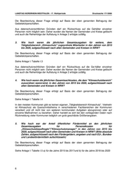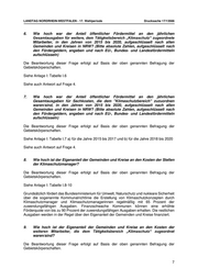 LANDTAG NORDRHEIN-WESTFALEN - 17. Wahlperiode Drucksache 17/13566 Die Beantwortung dieser Frage erfolgt auf Basis der oben genannten Befragung der Gebietskörperschaften. Aus datenschutzrechtlichen Gründen darf ein Rückschluss auf die Gehälter einzelner Personen nicht möglich sein. Daher wurden die Namen der Gemeinden und Kreise gelöscht und auch die Reihenfolge der Auflistung in Anlage 2 erfolgte zufällig. 3. Wie hoch waren die jährlichen Gesamtausgaben für weitere, dem Tätigkeitsbereich „Klimaschutz“ zugeordnete Mitarbeiter in den Jahren von 2015 bis 2020, aufgeschlüsselt nach allen Gemeinden und Kreisen in NRW? Die Beantwortung dieser Frage erfolgt auf Basis der oben genannten Befragung der Gebietskörperschaften. Siehe Anlage I: Tabelle I.3 Aus datenschutzrechtlichen Gründen darf ein Rückschluss auf die Ge-hälter einzelner Personen nicht möglich sein. Daher wurden die Namen der Gemeinden und Kreise gelöscht und auch die Reihenfolge der Auflistung in Anlage 2 erfolgte zufällig. 4. Wie hoch waren die jährlichen Gesamtsachkosten, die dem "Klimaschutzbereich" zuzuordnen waren/sind, in den Jahren von 2015 bis 2020, aufgeschlüsselt nach allen Gemeinden und Kreisen in NRW? Die Beantwortung dieser Frage erfolgt auf Basis der oben genannten Befragung der Gebietskörperschaften. Siehe Anlage I: Tabelle I.4 In den meisten Kommunen gibt es keinen eigenen „Tätigkeitsbereich Klimaschutz“. Vielmehr ist Klimaschutz als Querschnittsthema in verschiedenen Fachbereichen der Kommunen verankert und oft nicht klar von weiteren kommunalen Aufgaben abzugrenzen oder auf einzelne Maßnahmen zu beziehen. Daher handelt es sich bei den vorliegenden Daten nach Rückmeldung vieler Kommunen lediglich um grob geschätzte Größenangaben. 5. Wie hoch war der Anteil öffentlicher Fördermittel an den jährlichen Gesamtausgaben für Personalkosten für „Klimaschutzbeauftragte“/“Klimaschutzmanager“ in den Jahren von 2015 bis 2020, aufgeschlüsselt nach allen Gemeinden und Kreisen in NRW? (Bitte absolute Zahlen, aufgeschlüsselt nach den Fördergeldern, angeben und nach EU-, Bundes- und Landesfördermitteln aufschlüsseln) Die Beantwortung dieser Frage erfolgt auf Basis der oben genannten Befragung der Gebietskörperschaften. Siehe Anlage I: Tabelle I.5 a) für die Jahre 2015 bis 2017und b) für die Jahre 2018 bis 2020 6