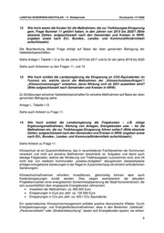 LANDTAG NORDRHEIN-WESTFALEN - 17. Wahlperiode Drucksache 17/13566 Siehe Anlage I: Tabelle I.8-10 Siehe auch Antwort zu Frage 4. 10. Wie hoch ist der Eigenanteil der Gemeinden und Kreise an den Sachkosten, die dem "Klimaschutzbereich" zugeordnet sind? Die Beantwortung dieser Frage erfolgt auf Basis der oben genannten Befragung der Gebietskörperschaften. Siehe Anlage I: Tabelle I.8-10 Siehe auch Antwort zu Frage 4. 11. Wie hoch sind die Einsparungen an CO2-Äquivalenten (in Tonnen), welche durch die Maßnahmen der „Klimaschutzbeauftragten“/“Klimaschutzmanager“ in den Jahren von 2015 bis 2020 bewirkt wurden, aufgeschlüsselt nach den Gemeinden und Kreisen in NRW? Die Beantwortung dieser Frage erfolgt auf Basis der oben genannten Befragung der Gebietskörperschaften. Grundsätzlich zielt die Einsetzung der Klimaschutzmanager und Klimaschutzmanagerinnen nicht darauf ab, eine ursächliche und auf sie rückführbare Minderung der Emissionen zu erwirken. Sie dienen vielmehr als Schnittstelle innerhalb der Kommune, zwischen den Bürgerinnen und Bürgern sowie den ansässigen Unternehmen und weiteren gesellschaftlichen Akteuren. Sie bündeln die Ressourcen der Kommune, um diese zielgerichtet für den Klimaschutz zu nutzen. Es ist nicht möglich, CO2-Einsparungen einzelnen Personen zuzuordnen, da die Maßnahmen zur Minderung von CO2 meist von vielen Akteuren gemeinsam und fachbereichsübergreifend umgesetzt werden. Ferner sind nicht alle Maßnahmen, die zwar nur indirekt, aber nicht unwesentlich zum Klimaschutz beitragen, bilanzierbar oder eine Bilanzierung erfolgt nicht, da hierzu keine Verpflichtung besteht beziehungsweise der Aufwand einer Bilanzierung zu groß wäre. Daher konnten in vielen Fällen, wenn überhaupt lediglich Teilergebnisse angegeben werden, die nicht die gesamte Wirksamkeit der Klimaschutzmaßnahmen abbilden. Auch wenn die Ermittlung von THG-Vermeidungs- bzw. Förderkosten rechnerisch möglich ist, stellen sich komplexe methodische Fragen. Ein pauschaler Rückschluss auf die Kosteneffizienz der Klimaschutzmaßnahmen der Gebietskörperschaften ist daher nicht möglich und mit schlichten Rechnungen gewonnene Ergebnisse bergen die Gefahr von Fehlinterpretationen. Aus diesen Gründen sahen sich viele Kommunen auch nicht in der Lage, die Fragen 11. und 12. adäquat zu beantworten. Siehe Anlage I: Tabelle I.11 8