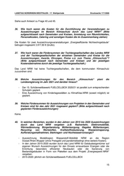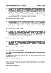 LANDTAG NORDRHEIN-WESTFALEN - 17. Wahlperiode Drucksache 17/13566 Frageblock VI: Bereiche des Kommunalen Klimaschutzes 49. Wie hoch ist die jeweilige Förderquote der Projekte zum kommunalen Klimaschutz in den Gemeinden und Kreisen in den Jahren von 2015 bis 2020 bezogen auf die Bereiche Radverkehr, Elektromobilität und Kraftstoffreduzierung, Wärmedämmung, Bürgerberatung, Wasserschutz und Wassereinsparung, Energieeinsparung sowie Aufforstungsmaßnahmen? (Bitte absolut und jahresscharf in allen Gemeinden und Kreisen NRWs aufschlüsseln) Die Beantwortung dieser Frage erfolgt auf Basis der oben genannten Befragung der Gebietskörperschaften. Siehe Anlage VI.: Tabelle VI.49a – Tabelle VI.49g 50. Welche Gesamtkosten sind den Gemeinden und Kreisen durch die Ist- Bestandsaufnahme der jeweiligen Klimasituation entstanden? (Bitte nach Gemeinden und Kreisen sowie den jeweiligen Kosten für die einzelnen Maßnahmen aufschlüsseln) Die Beantwortung dieser Frage erfolgt auf Basis der oben genannten Befragung der Gebietskörperschaften. Siehe Anlage VI.: Tabelle VI.50 VI.A Elektromobilität und Kraftstoffreduzierung 51. Welche Maßnahmen im Bereich Elektromobilität und Kraftstoffreduzierung wurden in den Gemeinden und Kreisen NRWs mit welchen jeweiligen voraussichtlichen Gesamtkosten geplant? (Bitte nach Gemeinden und Kreisen sowie den jeweiligen Kosten für die einzelnen Maßnahmen aufschlüsseln) Die Beantwortung dieser Frage erfolgt auf Basis der oben genannten Befragung der Gebietskörperschaften. Siehe Anlage VI.A: Tabelle VI.A.51-54 52. Welche dieser Maßnahmen wurden im Zeitraum von 2015 bis Juni 2020 umgesetzt, und wie hoch waren die Gesamtkosten? Die Beantwortung dieser Frage erfolgt auf Basis der oben genannten Befragung der Gebietskörperschaften. Siehe Anlage VI.A: Tabelle VI.A.51-54 53. Welche der geplanten Maßnahmen werden durch die Gemeinden und Kreise voraussichtlich noch bis Dezember 2021 umgesetzt? Die Beantwortung dieser Frage erfolgt auf Basis der oben genannten Befragung der Gebietskörperschaften. 18