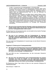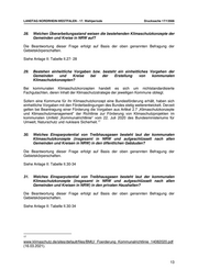 LANDTAG NORDRHEIN-WESTFALEN - 17. Wahlperiode Drucksache 17/13566 28. Welchen Überarbeitungsstand weisen die bestehenden Klimaschutzkonzepte der Gemeinden und Kreise in NRW auf? Die Beantwortung dieser Frage erfolgt auf Basis der oben genannten Befragung der Gebietskörperschaften. Siehe Anlage II: Tabelle II.27- 28 29. Bestehen einheitliche Vorgaben bzw. besteht ein einheitliches Vorgehen der Gemeinden und Kreise bei der Erstellung von kommunalen Klimaschutzkonzepten? Bei kommunalen Klimaschutzkonzepten handelt es sich um nichtstandardisierte Fachgutachten, deren Inhalt der Klimaschutzstrategie der jeweiligen Kommune obliegt. Sofern eine Kommune für ihr Klimaschutzkonzept eine Bundesförderung erhält, haben sich einheitliche Vorgaben mit den Förderbedingungen des Bundes stetig weiterentwickelt. Derzeit gelten bei Beantragung einer Förderung die Vorgaben aus Artikel 2.7 „Klimaschutzkonzepte und Klimaschutzmanagement“ der Richtlinie zur Förderung von Klimaschutzprojekten im kommunalen Umfeld „Kommunalrichtlinie“ vom 22. Juli 2020 des Bundesministeriums für 17 Umwelt, Naturschutz und nukleare Sicherheit. 30. Welches Einsparpotential von Treibhausgasen besteht laut der kommunalen Klimaschutzkonzepte (insgesamt in NRW und aufgeschlüsselt nach allen Gemeinden und Kreisen in NRW) in den öffentlichen Gebäuden? Die Beantwortung dieser Frage erfolgt auf Basis der oben genannten Befragung der Gebietskörperschaften. Siehe Anlage II: Tabelle II.30-34 31. Welches Einsparpotential von Treibhausgasen besteht laut der kommunalen Klimaschutzkonzepte (insgesamt in NRW und aufgeschlüsselt nach allen Gemeinden und Kreisen in NRW) in den privaten Haushalten? Die Beantwortung dieser Frage erfolgt auf Basis der oben genannten Befragung der Gebietskörperschaften. Siehe Anlage II: Tabelle II.30-34 17 www.klimaschutz.de/sites/default/files/BMU/_Foerderung_Kommunalrichtlinie_14082020.pdf (16.03.2021). 13