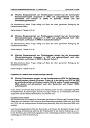 LANDTAG NORDRHEIN-WESTFALEN - 17. Wahlperiode Drucksache 17/13566 - In 2020: 11 Auszeichnung von Kindertagesstätten zu KlimaKitas.NRW - Mit dem Effizienz-Preis NRW und dem Nachwuchspreis MehrWert NRW werden nachhaltige und innovative Produkte und Dienstleistungen ausgezeichnet, die zur Ressourcen- und Umweltschonung beitragen. Neben den Preisgebern Effizienz- Agentur NRW und Verbraucherzentrale NRW ist auch die NRW.Bank als Kooperationspartner beteiligt. - Zehn NRW-Kommunen (namentlich die Städte Aachen, Bocholt, Bottrop, Greven, Hürth, Ibbenbüren, Neuss, Oberhausen, Rietberg und Siegen) haben im Rahmen des Modellversuches "eea-Plus" (Laufzeit 2014-2017) erfolgreich individuelle und integrierte Maßnahmen der Klimaanpassung entwickelt und dafür im Jahr 2018 eine Auszeichnung erhalten. Die Ergebnisse des Modellversuchs dienten der Entwicklung des European Climate Adaptation Award (eca), der das Pendant zum EEA (European Energy Award) darstellt und es Kommunen ermöglicht, die Erarbeitung von lokal notwendigen Klimaanpassungsmaßnahmen auf Grundlage einer Klimaanalyse vorzunehmen. 41. Wie hoch ist der prozentuale Anteil der Preisträger, welche eine Auszeichnung für Projekte erhalten haben, die nicht durch die kommunale Selbstverwaltung oder eine ihrer Tochtergesellschaften initiiert wurden? Auf diese Frage kann nicht geantwortet werden, da nicht deutlich wird auf welche Preisträger insgesamt Bezug genommen werden soll. 42. Wie hoch ist der prozentuale Anteil der Fördergeldpreise für diejenigen Preisträger, welche eine Auszeichnung für Projekte erhalten haben, die nicht durch die kommunale Selbstverwaltung oder eine ihrer Tochtergesellschaften initiiert wurden? Das Land vergibt keine Fördergeldpreise für Auszeichnungen, die dem Bereich Klimaschutz zuzuordnen sind. Frageblock IV: Förderung durch Tochtergesellschaften 43. Wie hoch waren die Fördersummen durch die Tochtergesellschaften des Landes für Projekte, die dem kommunalen Klimaschutz zugeordnet werden, in den Gemeinden und Kreisen? (Bitte aufgeschlüsselt nach begünstigter Kommune, den Kosten und der jeweiligen Tochtergesellschaft) Das Land NRW hat keine Tochtergesellschaften, die dem kommunalen Klimaschutz zugeordnet sind. 44. Wie hoch waren die Fördersummen durch Tochtergesellschaften der einzelnen Gemeinden und Kreise für Projekte, die dem kommunalen Klimaschutz zugeordnet werden, in den Gemeinden und Kreisen? (Bitte aufgeschlüsselt nach begünstigter Kommune, den Kosten und der jeweiligen Tochtergesellschaft) Die Beantwortung dieser Frage erfolgt auf Basis der oben genannten Befragung der Gebietskörperschaften. Siehe Anhang IV.: Tabelle IV.44 16
